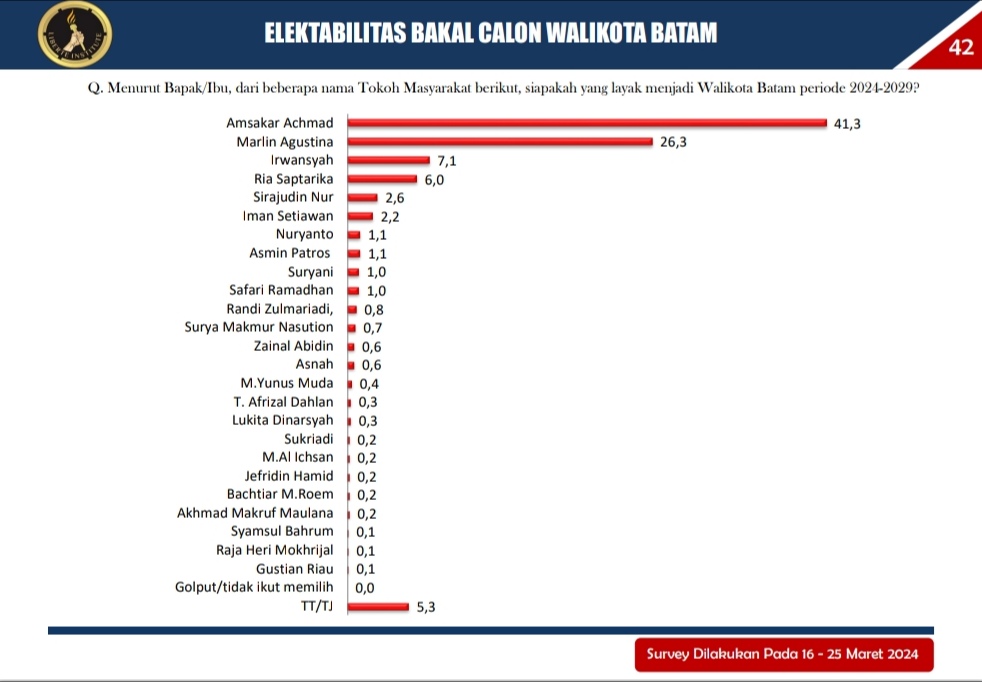 Sebelumnya, diberitakan Lembaga Survey, Konsultan Politik dan Kebijakan Publik, Liberte Institute melakukan survey calon Walikota dan Wakil Walikota Kota Batam yang dilakukan pada 16 hingga 25 Maret 2024.