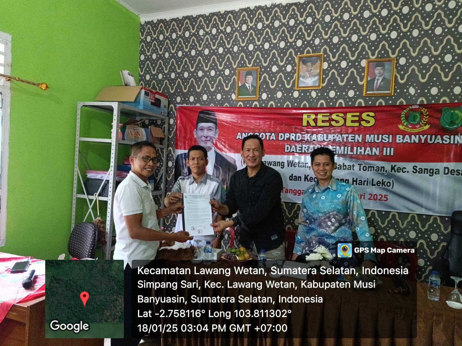 Musi Banyuasin (Sumsel) Kompas86.com__, Anggota DPRD Muba M. Tanzil Asrori dari partai Hati Nurani Rakyat ( Hanura) Kabupaten Musi Banyuasin, menggelar kegiatan reses di Desa Simpang Sari Kecamatan Lawang Wetan Kabupaten Musi Banyuasin pada awal tahun 2025.