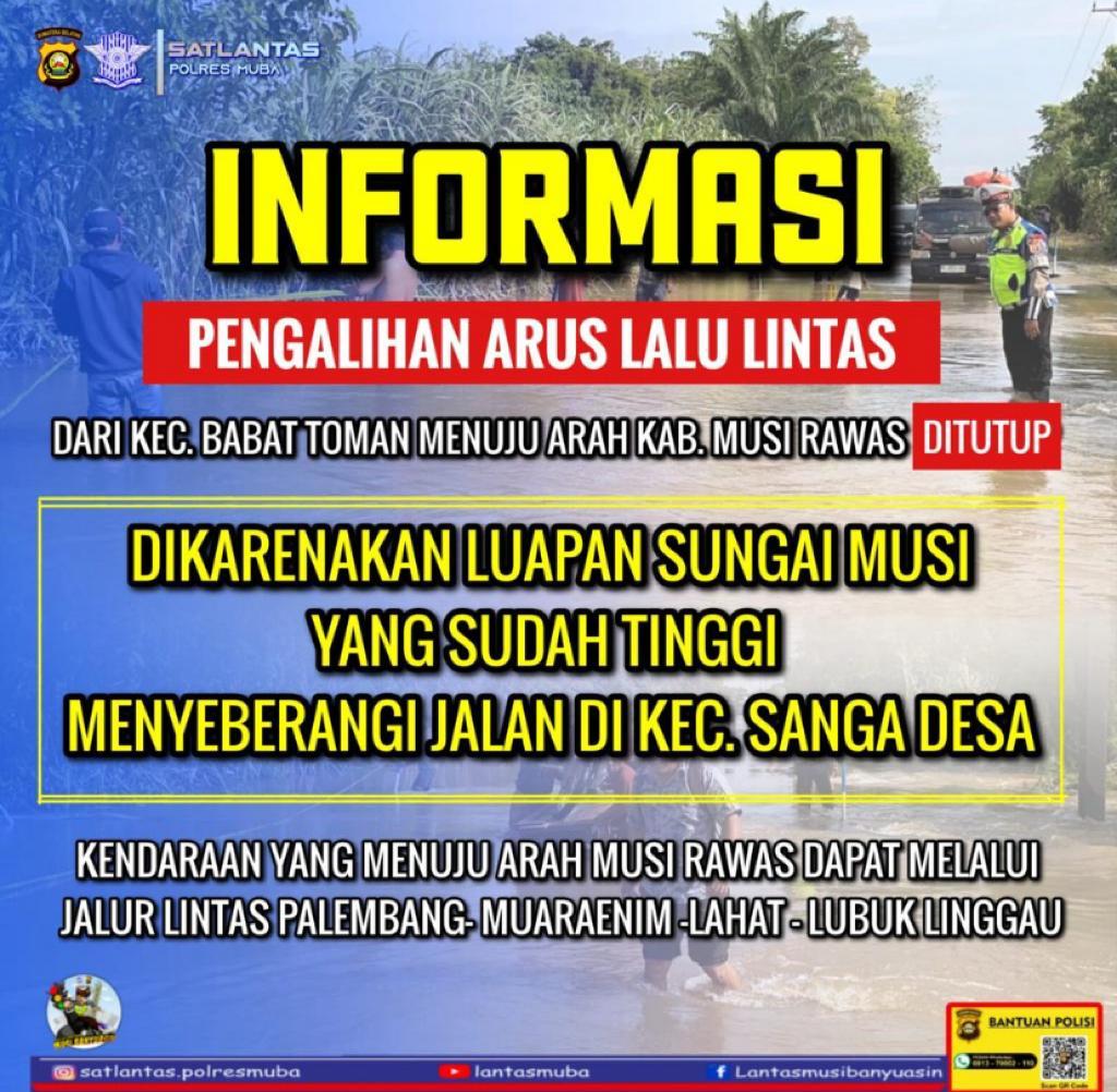 Menindaklanjuti kondisi jalan yang tergenang air ini kami mengambil langkah-langkah mengumumkan kepada masyarakat mengenai kondisi jalan tersebut melalui berbagai media, baik media elektronik, Media cetak, Media Online maupun Media Sosial, Menginformasikan bahwa ada pengalihan Arus lalulintas, dimana jalur lalulintas dari Kecamatan Babat Toman – Musirawas atau sebaliknya dari Musirawas- Kecamatan Babat Toman (Muba) ditutup, dikarenakan adanya luapan air sungai Musi yang sudah tinggi menggenangi jalan di Kecamatan Sanga Desa, untuk itu disarankan bagi kendaraan dari Palembang ke Musi Rawas dan melewati Muba, agar melalui jalur lintas Palembang – Muara enim – lahat – lubuk Linggau. Ujarnya.