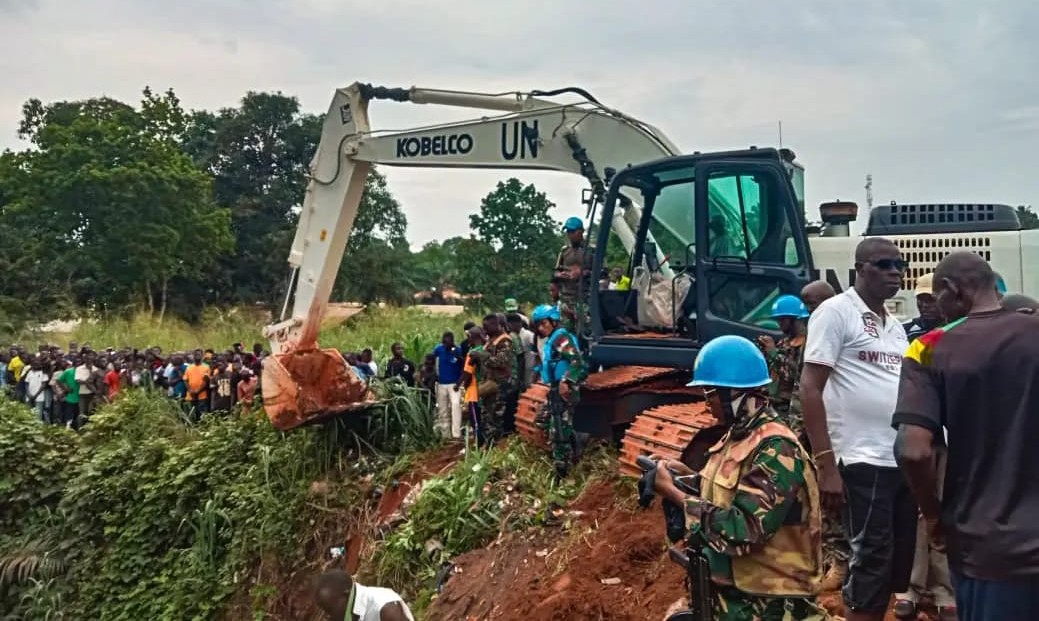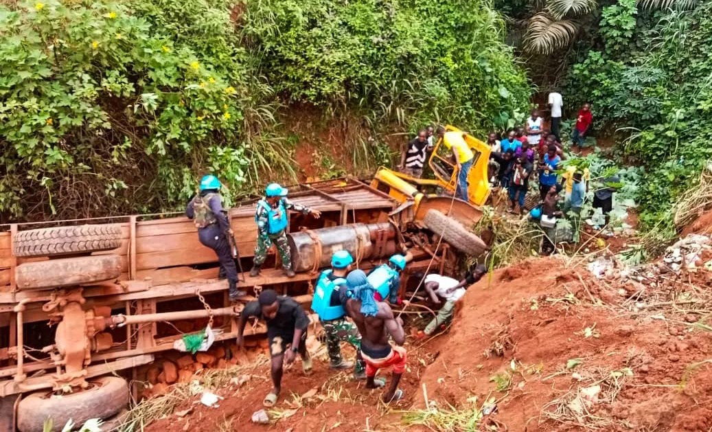 Satgas Kizi TNI Konga XXXVII-J Minusca Car membantu evakuasi truk kecelakaan yang terguling ke dalam jurang sedalam 8 meter yang berlokasi di jalan Pasar Besar sektor TOB Berberati, Minggu (23/06/2024).