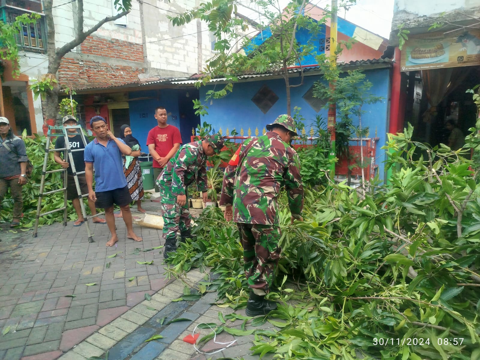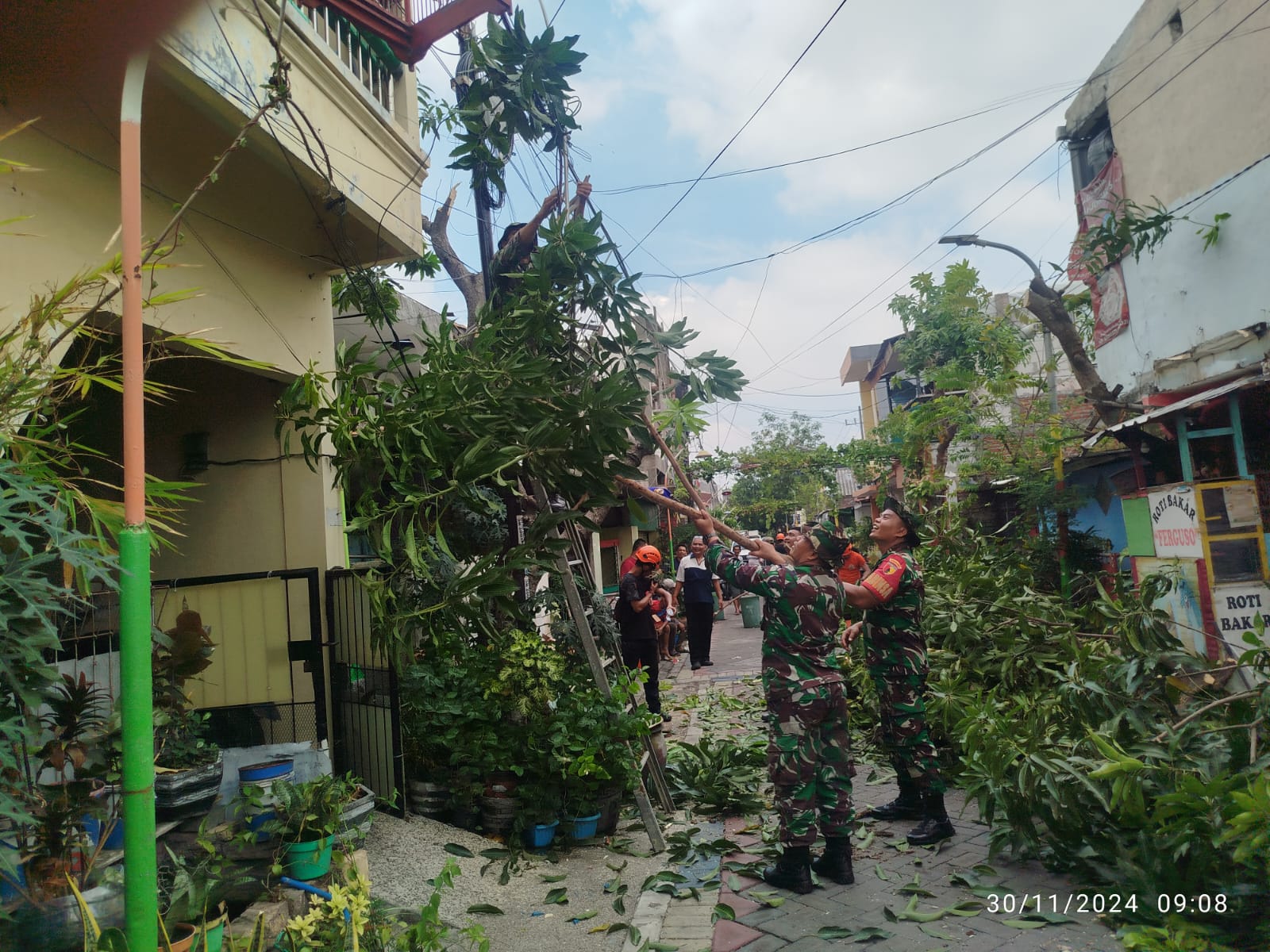 Surabaya |Jatim | Personel Koramil 0831/04 Sukolilo bersama instansi terkait bergotong royong membersihkan puing-puing pohon tumbang di RT 1-4 RW 12, Kelurahan Manyar Sabrangan, Kecamatan Mulyorejo, Sabtu pagi. Karya bakti ini digelar sebagai respons atas dampak angin puting beliung yang melanda wilayah tersebut.