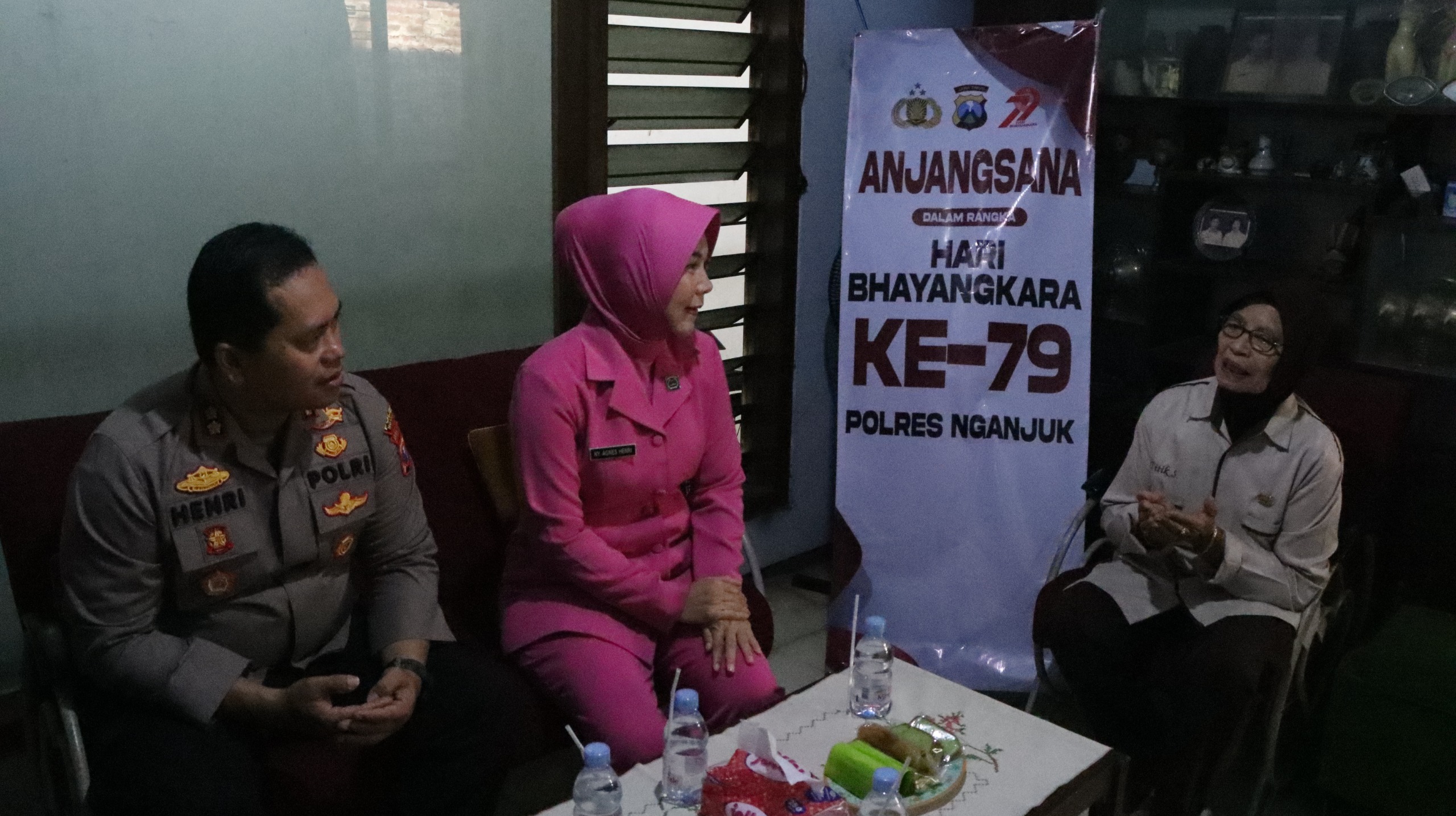 Nganjuk |Jatim| Sebagai bentuk kepedulian dan penghormatan di momen Hari Bhayangkara ke-79, Kapolres Nganjuk AKBP Henri Noveri Santoso bersama Ketua Bhayangkari Cabang Nganjuk Ny. Agnes Henri menggelar kegiatan anjangsana dengan menyambangi keluarga besar Polri, Senin (16/6/2025).