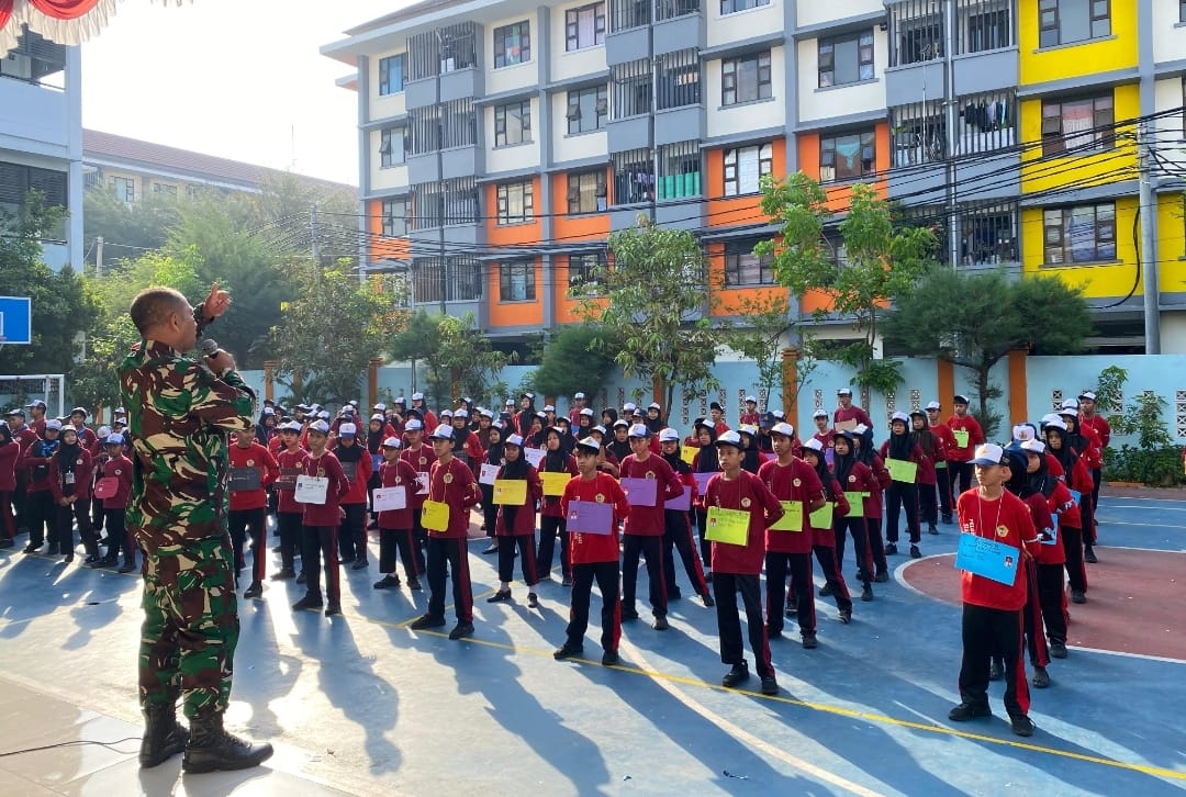 Surabaya |Jatim | Babinsa Kelurahan Romokalisari Koramil 0830/06 Benowo Sertu M. Qomaruddin, memberikan materi Peraturan Baris-Berbaris (PBB) dalam kegiatan Latihan Dasar Kepemimpinan Siswa (LDKS) di SMPN 63 Surabaya Romokalisari, Kecamatan Benowo, Sabtu (19/10).