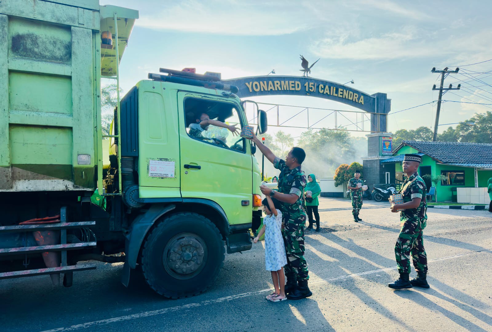Salah satu cara melakukan kebaikan di Bulan Suci Ramadhan adalah dengan berbagi, hal ini pula yang dilakukan prajurit Yonarmed 15/Cailendra dengan berbagi takjil gratis di depan Asrama Yonarmed 15/Cailendra.