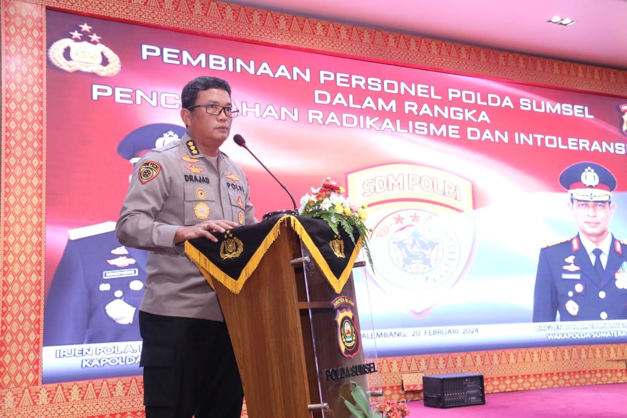 Demikian diuraikan Kapolda Sumsel Irjen A Rachmad Wibowo melalui amanat yang disampaikan Karo SDM Kombes Sudrajad Hariwibowo Sik Msi saat membuka acara sosialisasi penanggulangan dan pencegahan radikalisme, intoleransi bagi personel jajaran Polda Sumsel hari Selasa (20/2/2024) di Mapolda.