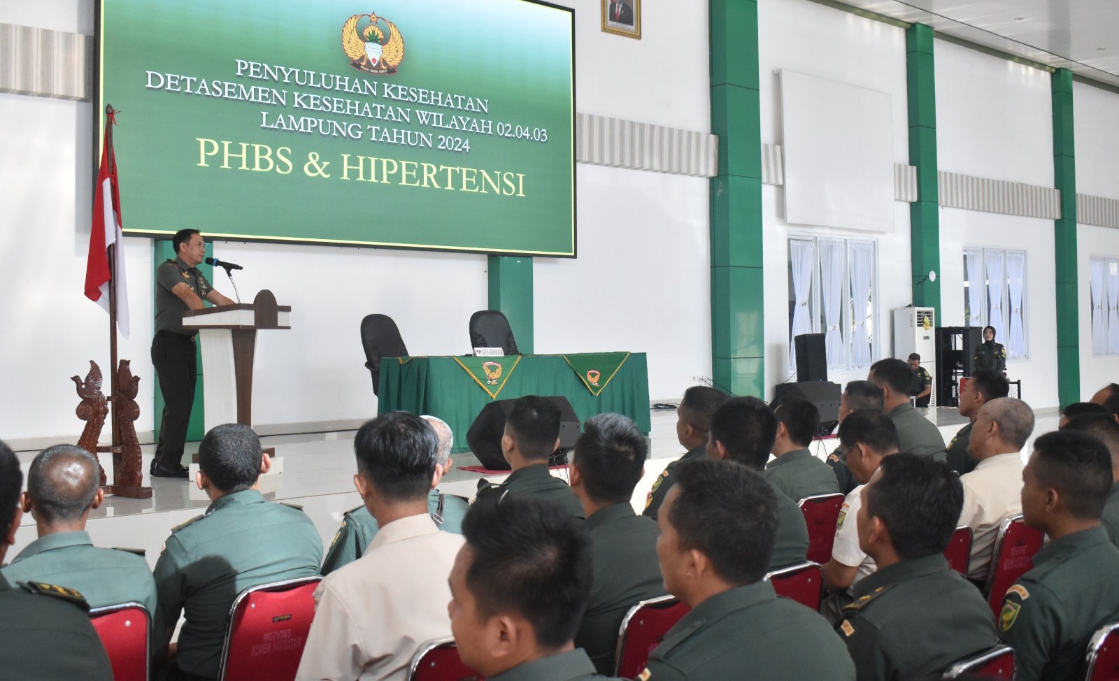 “Berkenaan dengan hal tersebut, hari ini kita mengikuti penyuluhan kesehatan dalam rangka melaksanakan program kerja kesehatan TW I Tahun 2024, dengan tujuan agar Prajurit dan PNS jajaran Korem 043/Gatam dapat memahami serta mengerti tentang kesehatan“.