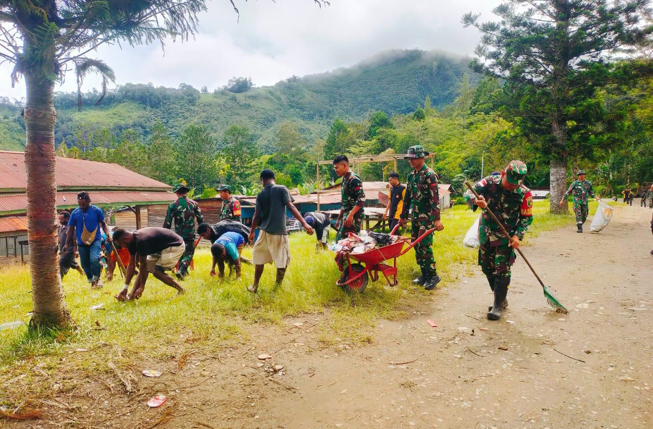 Satgas Yonif 200/BN melalui Pos Kelila melaksanakan gotong royong bersama masyarakat dalam rangka menciptakan kampung yang sehat dan bersih bertempat di Kampung Kelila, Distrik Kelila, Kab. Mamberamo Tengah, Papua Pegunungan, Kamis (21/03/2024).
