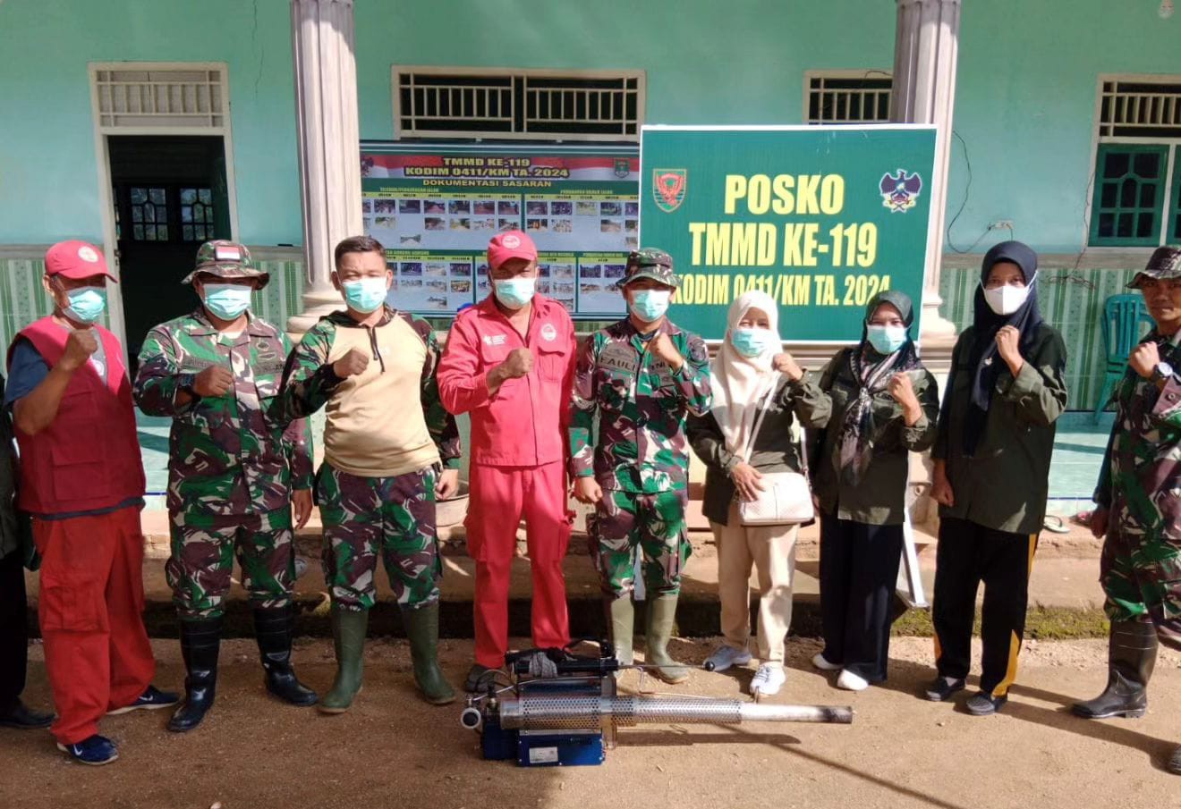 Guna mengantisipasi pencegahan penyebaran penyakit demam berdarah, Satgas TMMD-119 Kodim 0411/KM bersinergi bersama Puskesmas Pubian dan aparatur Kampung Gunung haji melaksanakan kegiatan fogging bertempat di Kampung Gunung Haji Kec. Pubian Kab. Lampung Tengah.