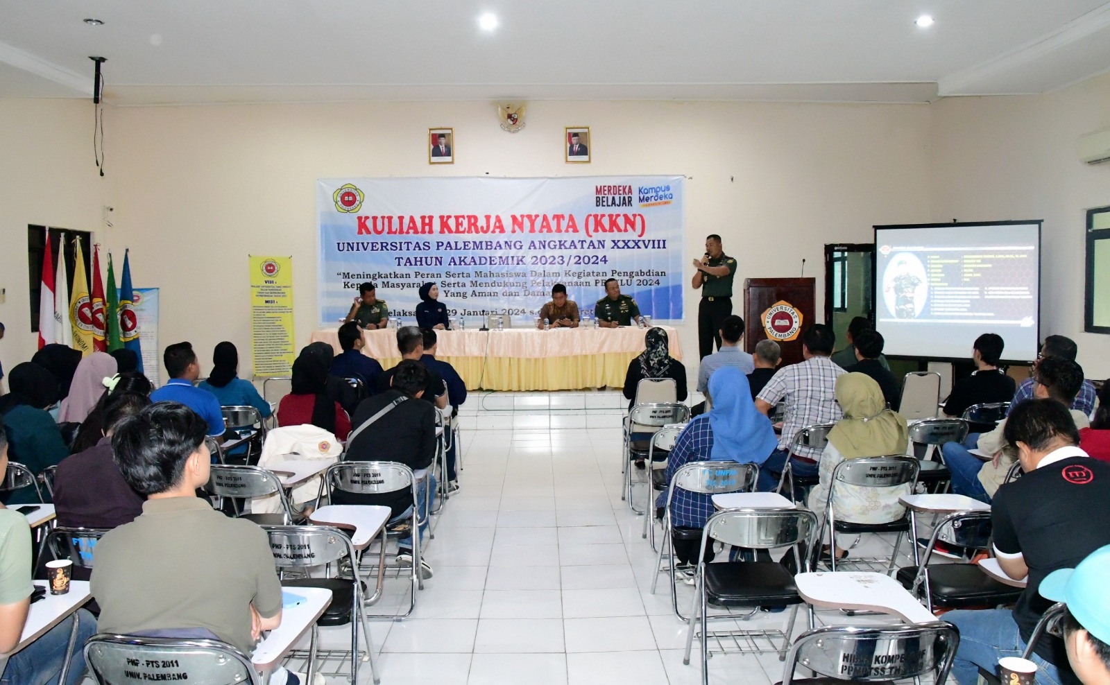 Danrem 044/Gapo Brigjen TNI Muhammad Thohir, S.Sos., M.M selaku Narasumber memberikan pembekalan kepada Mahasiswa Unpal peserta KKN Angkatan ke XXXVIII tahun akademik 2023/2024, bertempat di Jalan Dharmapala No. IA Bukit Besar Palembang, Jumat (26/1/2024).