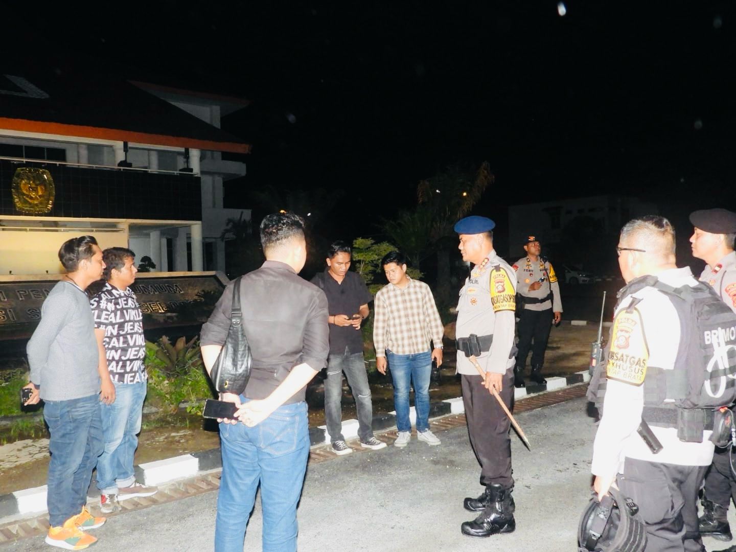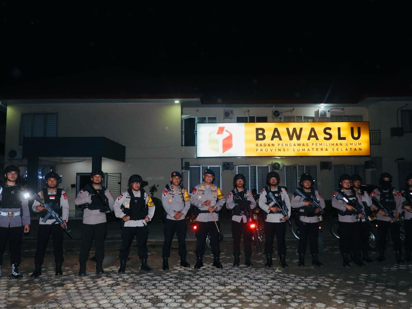 Dengan kekuatan sebanyak duapuluh lima personel lengkap, tim patroli menggunakan sepuluh unit roda dua dan satu unit kendaraan taktis (rantis) Reimong menyambangi kantor KPU dan kantor Bawaslu Provinsi Sumsel.