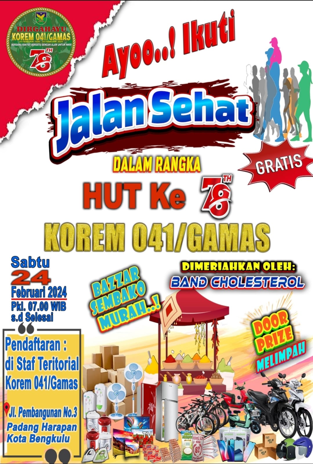 Dalam rangka Hari Ulang Tahun (HUT) ke-78, Korem 041/Gamas Bengkulu menggelar berbagai kegiatan, salah satunya jalan sehat.