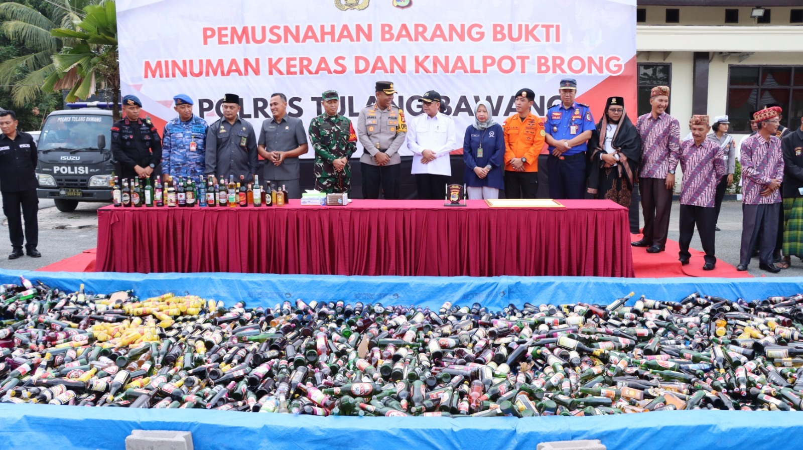 Tulang bawang,Kompas86.Com Polres Tulang Bawang, Polda Lampung, menggelar kegiatan pemusnahan barang bukti (BB) berupa ribuan botol minuman keras (miras) dan puluhan unit knalpot brong yang merupakan hasil dari dua Operasi Kepolisian.