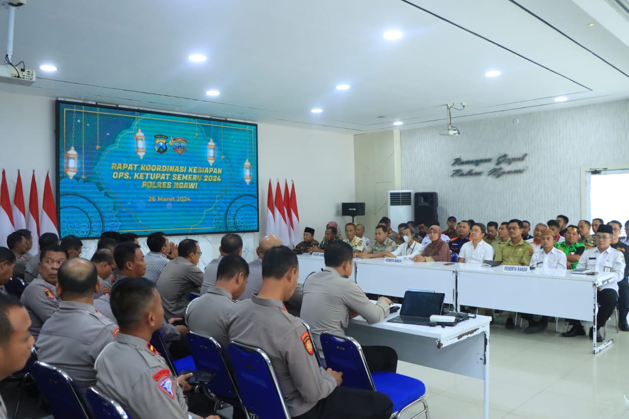 Jelang Hari Raya Idul Fitri 1445 H, Polres Ngawi Polda Jatim bersama seluruh jajaran Forum Koordinasi Pimpinan Daerah (Forkopimda) Kab. Ngawi menggelar rapat koordinasi (Rakor) eksternal lintas sektoral dalam rangka Operasi Ketupat Semeru 2024, bertempat di ruang Guyup Polres Ngawi, pada Selasa (26/3/2024).
