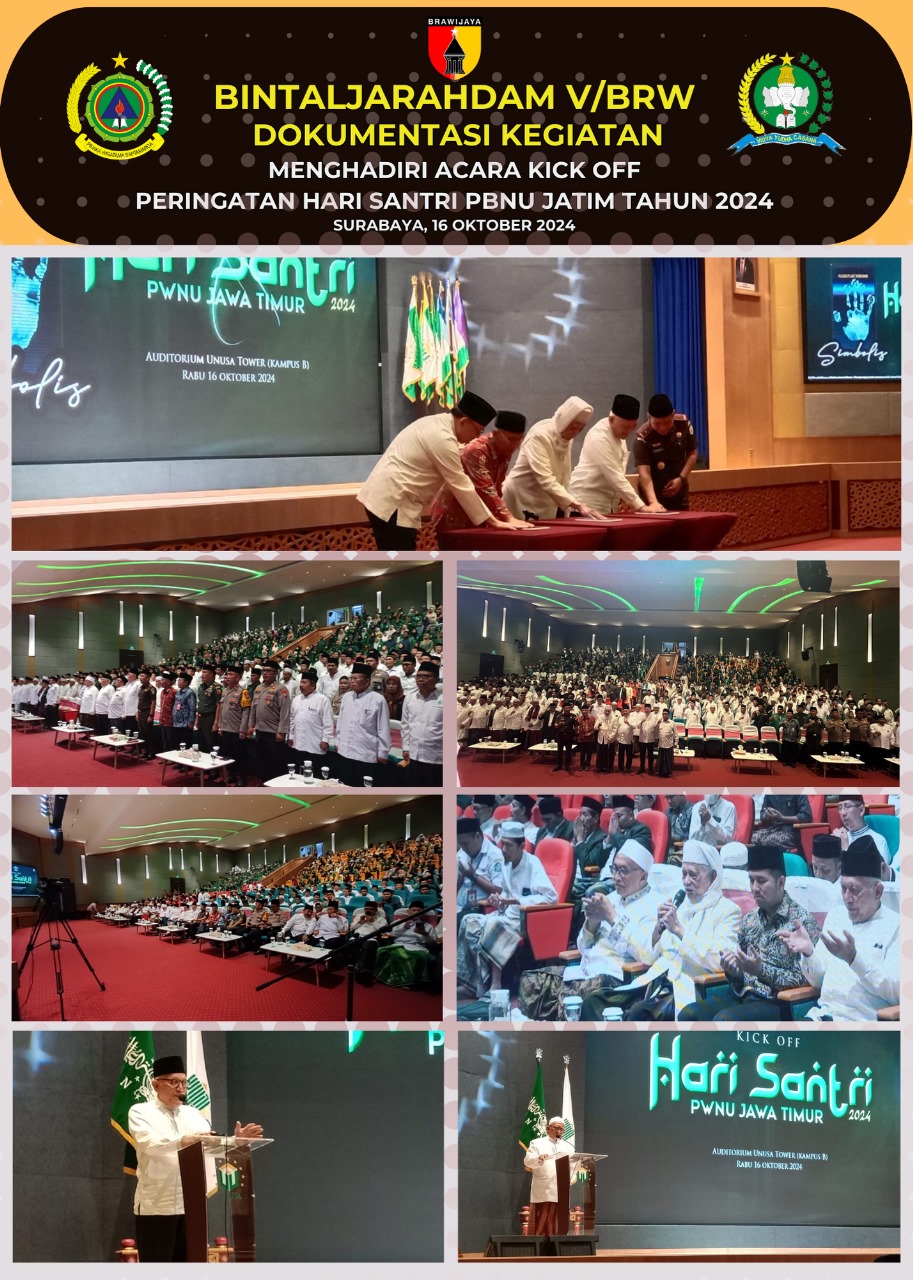 Surabaya |Jatim | Kabintaldam V/Brawijaya Kolonel Idang Ismail menghadiri berlangsungnya Kick Off Peringatan Hari Santri PWNU Jatim yang berlangsung di Gedung Unusa, Jalan Jemursari, Kota Surabaya. Rabu (16/10/2024).