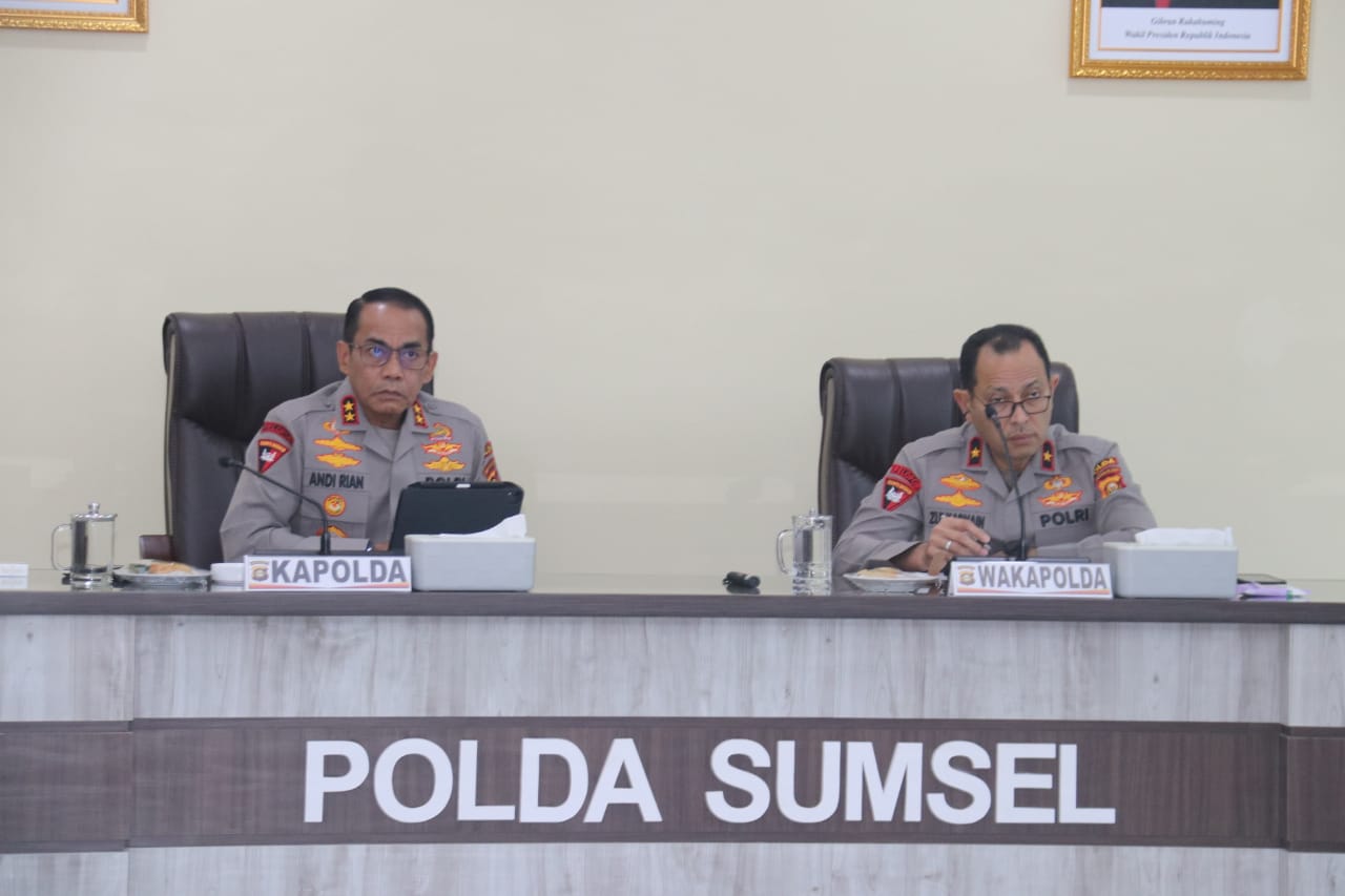 Palembang, – – Kapolda Sumsel Irjen Pol Andi Rian R Djajadi, didampingi oleh Wakapolda Sumsel Brigjen Pol M, Zulkarnain para Pejabat Utama (PJU) Polda Sumsel, serta seluruh Kapolres/Tabes/Kapolsek/ta jajaran mengikuti kegiatan Arahan Kapolri dan Analisa serta Evaluasi (ANEV) Perkembangan Situasi Kamtibmas Terkini secara virtual (Vicon),diruang Vidcon Gedung Utama Presisi Mapolda Sumsel Jalan Jenderal Sudirman KM 4 Palembang pada Kamis (31/7/2025) siang