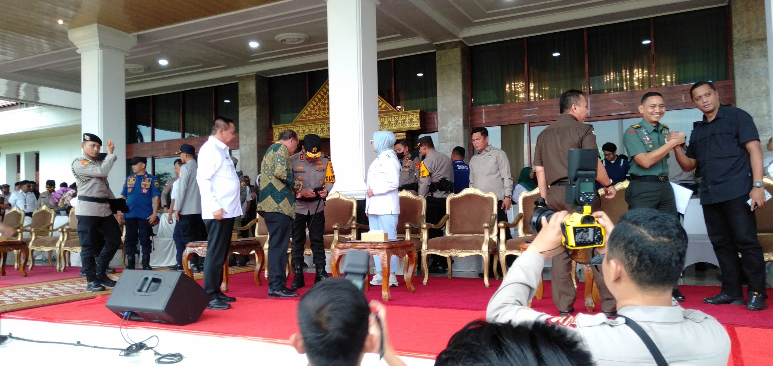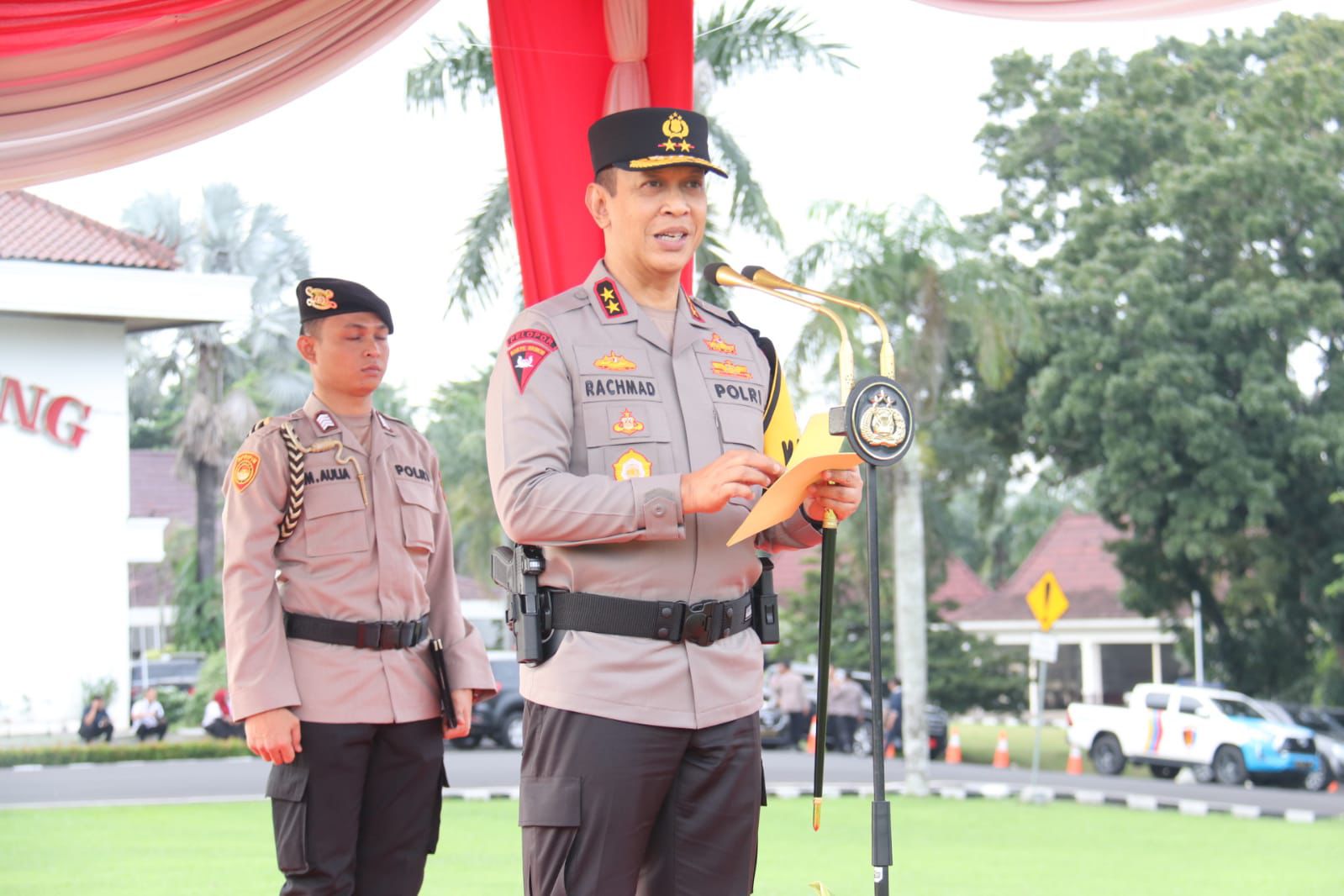 PALEMBANG – Usai memimpin rapat koordinasi lintas sektoral pengamanan lebaran, Kapolda Sumsel Irjen A Rachmad Wibowo memimpin apel gelar pasukan personel pengamanan operasi Ketupat Musi 2024, pengamanan mudik lebaran 1445 H, dihalaman Griya Agung Palembang Rabu (3/4/2024).