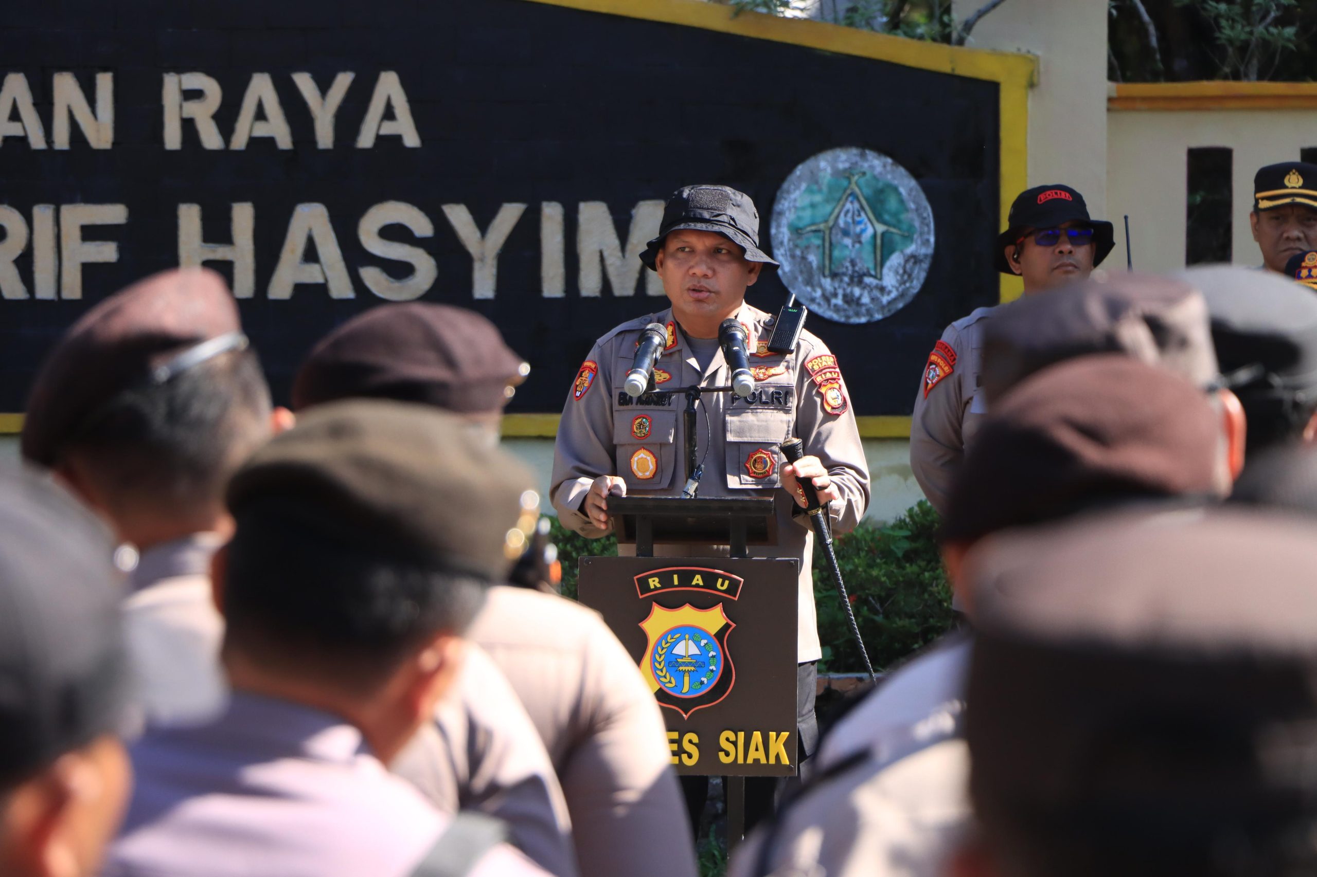Dalam rangka memastikan kesiapan pengamanan Jambore Karhutla Riau 2025, Kapolres Siak AKBP Eka Ariandy Putra, S.H., S.I.K., M.Si. memimpin langsung apel gladi bersih yang digelar di lapangan depan Gerbang Taman Hutan Raya (Tahura) Sultan Syarif Hasyim, Kecamatan Minas, Kamis, 25 April 2025, pukul 09.00 Wib.