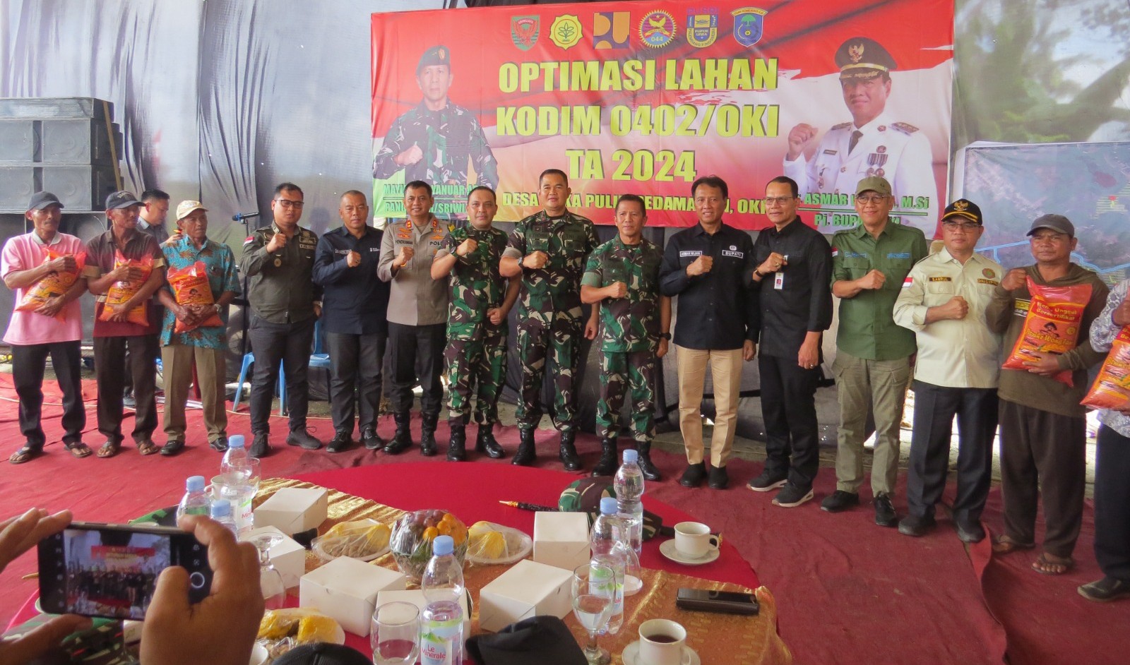 Komandan Kodim 0402/OKI Letkol Inf Irsyad Mahdi Pane bersama Forkopimda OKI mendampingi Pangdam II Sriwijaya Mayjen TNI Yanuar Adil meninjau lokasi program optimasi lahan (Opla) tahun 2024 seluas 270 Hektar di desa Suka Pule Dusun 6 Kecematan Pedamaran Kabupaten Ogan Komering Ilir, Minggu (10/03/2024).