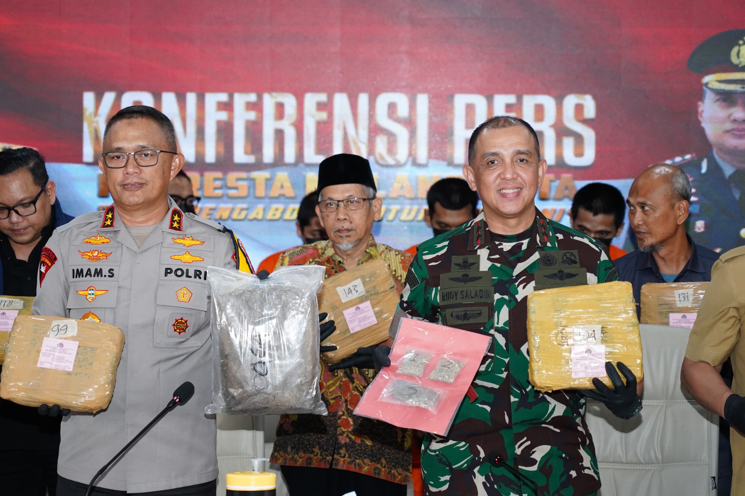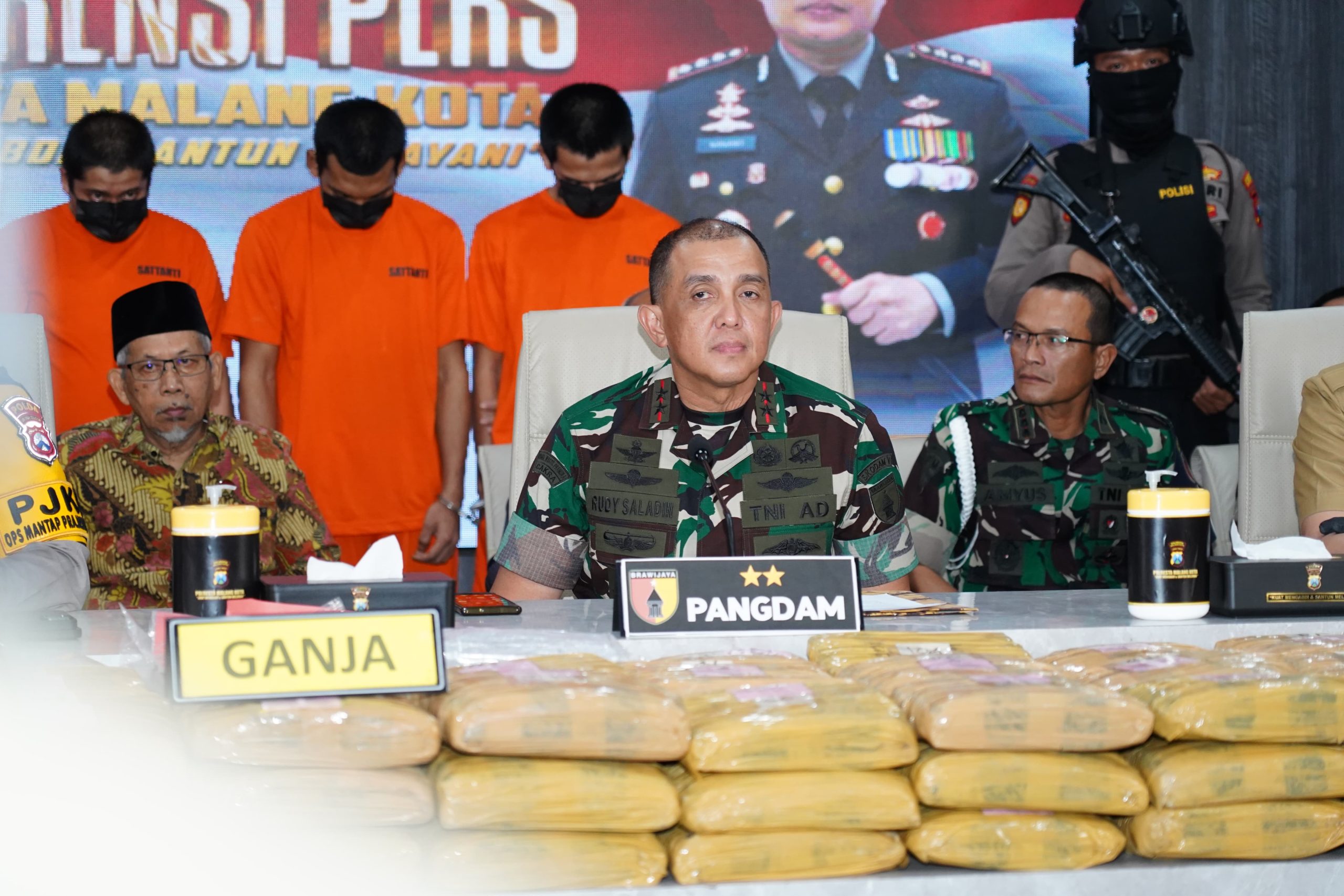 Kota Malang |Jatim | Pangdam V/Brawijaya, Mayjen TNI Rudy Saladin, M.A., dan Kapolda Jatim, Irjen. Pol. Drs. Imam Sugianto, M.Si., menggelar konferensi pers yang menarik perhatian terkait penggagalan peredaran ganja seberat 166,88 kilogram di Malang. Keberhasilan ini menegaskan komitmen dalam pemberantasan narkoba.