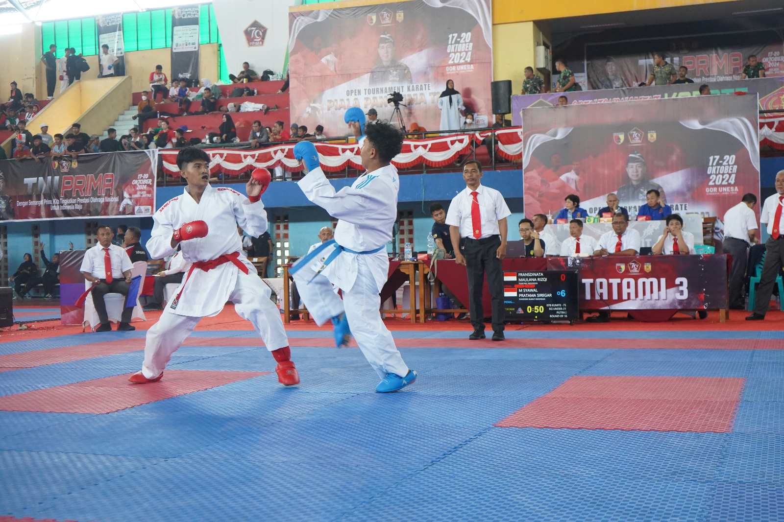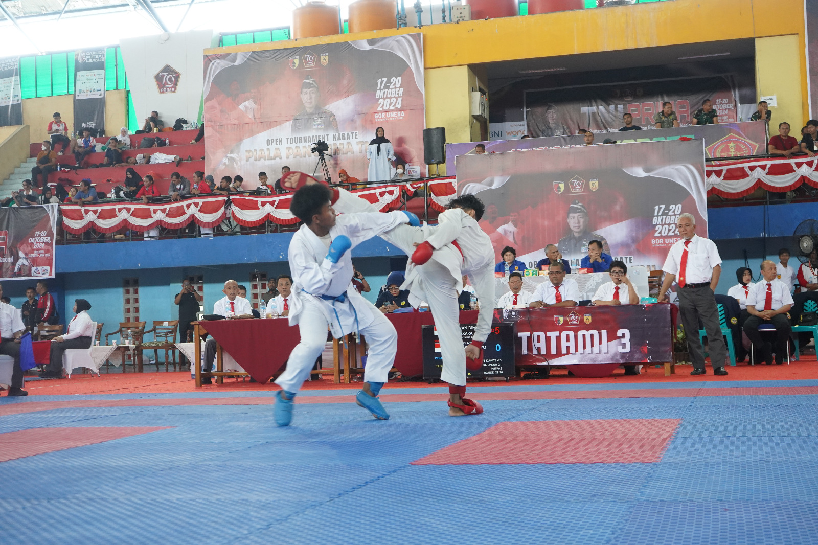 Surabaya |Jatim | Open Tournament Karate Piala Panglima TNI yang dilaksanakan di GOR Unesa Surabaya menarik perhatian ratusan kontingen dan ribuan atlet dari berbagai daerah di Indonesia. Jumat, 18/10/2024.
