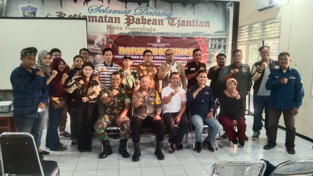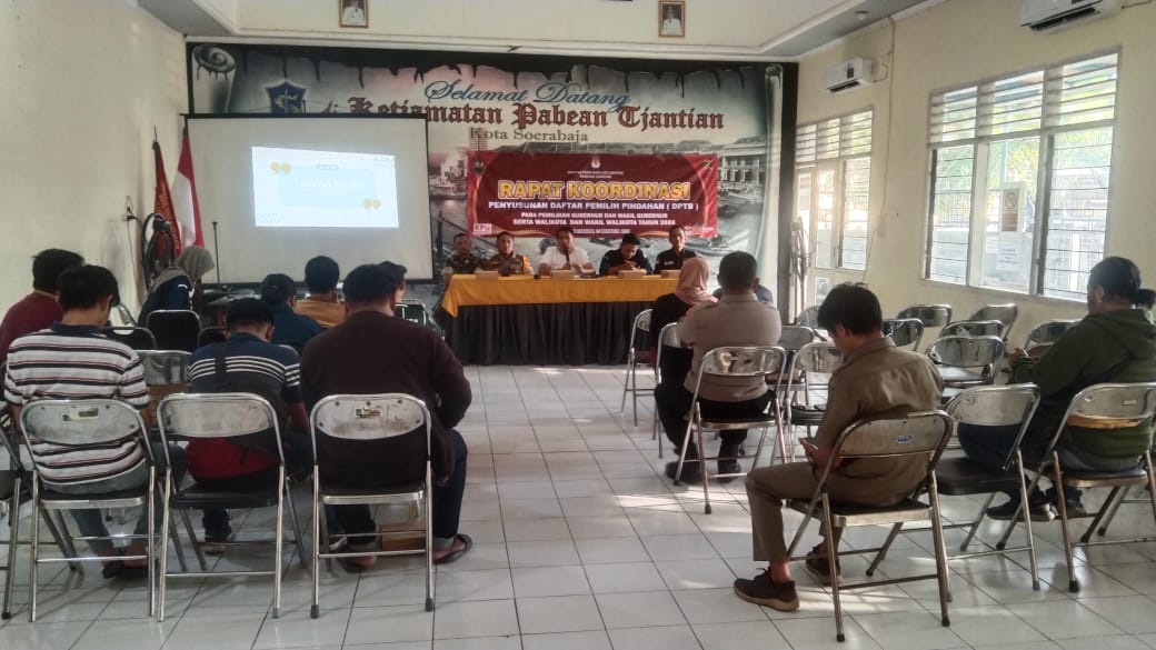 Surabaya |Jatim | Rapat Koordinasi Penyusunan Daftar Pemilih Pindahan (DPTB) digelar di Aula Kecamatan Pabean Cantian, Jalan Teluk Sampit No. 2A, Kelurahan Tanjung Perak. Kegiatan yang berlangsung mulai pukul 15.00 WIB ini dihadiri oleh sejumlah pejabat kecamatan dan perwakilan lembaga terkait, Selasa (15/10).