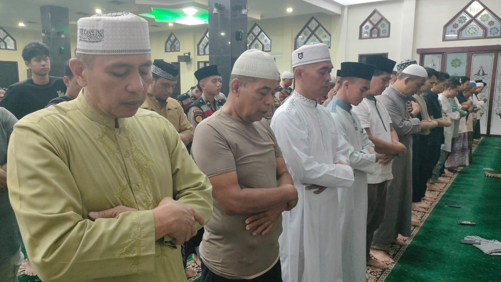 SH,SIK dan para PJU Polda Sumsel melaksanakan sholat tarawih berjamaah di Masjid di Alaman Komplek perumahan Polri Pakri Jalan Jendral Bambang Utoyo Palembang, Sabtu (1/03/25) malam Ahad