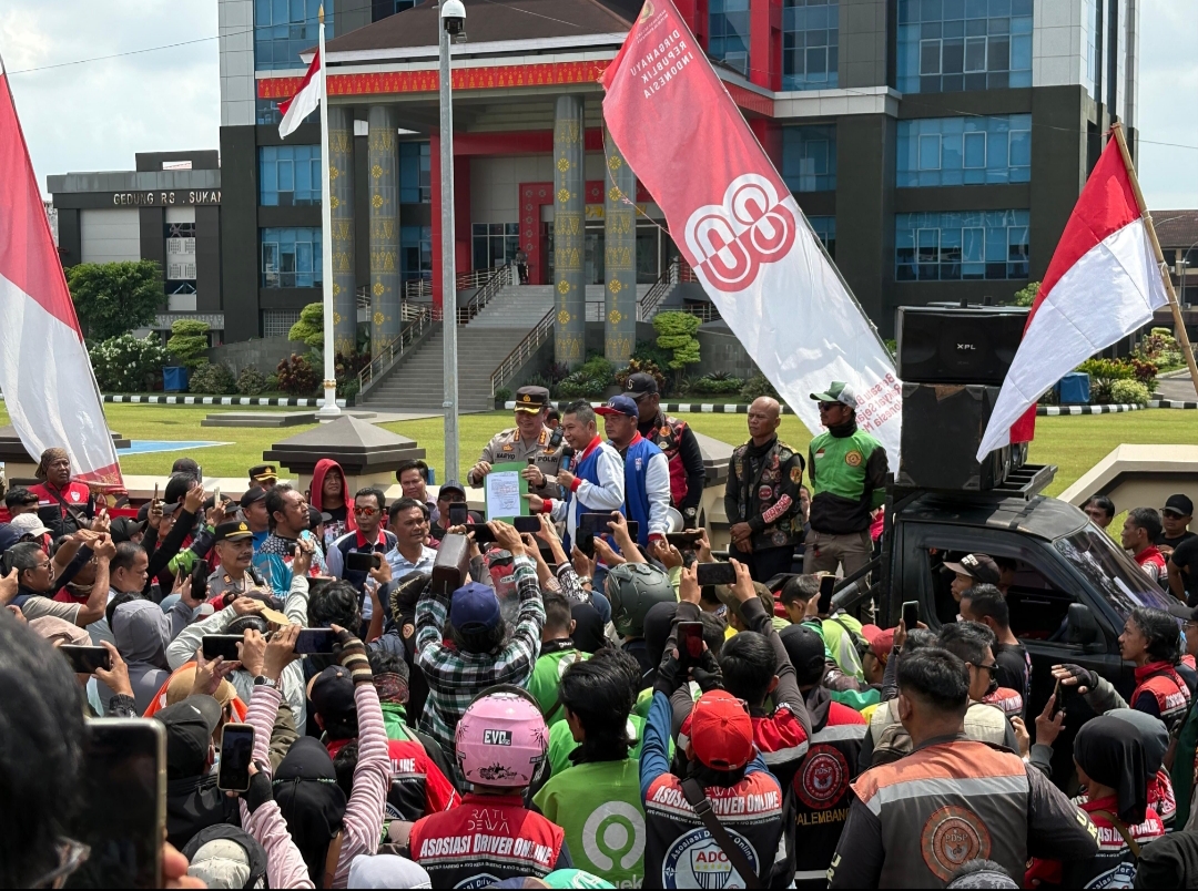 Palembang – Massa pengemudi ojek online (ojol) yang tergabung dalam Asosiasi Driver Online (ADO) Sumsel menggelar aksi damai sembari bersholawat dan kalimat takbir di depan markas Polda Sumsel, Kota Palembang, Sabtu 30/08/2025