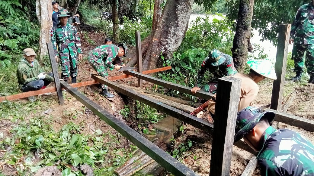 Prajurit Satgas Pamtas RI-Malaysia Yonarhanud 12/SBP yang berada di Pos Long Jelet Kec. Pujungan Kab. Malinau, Kalimantan Utara, turun tangan bantu warga bangun jembatan penghubung desa ke ladang
