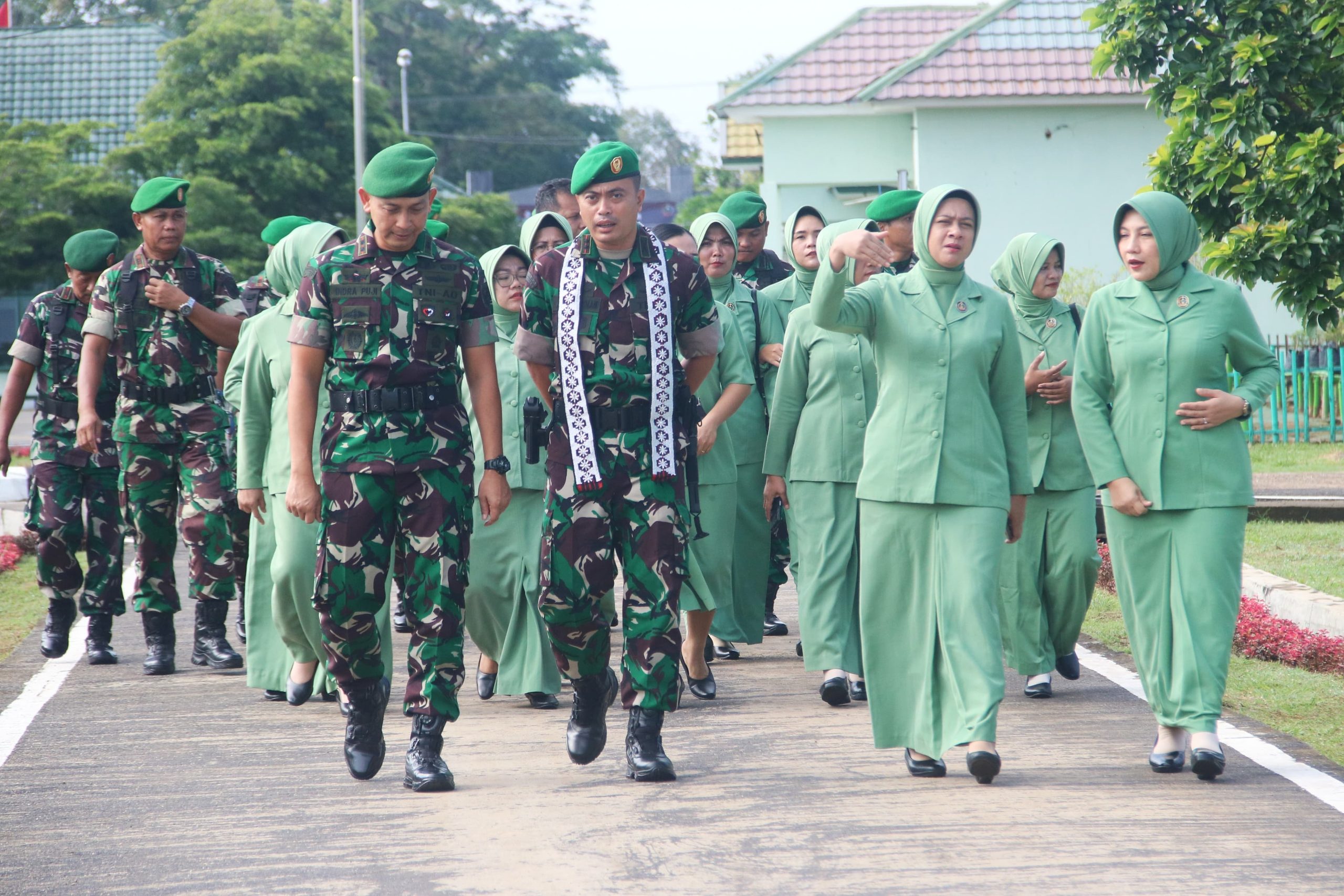 Diawali dengan penyambutan oleh pejabat Dandim lama Letkol Czi Indra Puji Triwanto, S.H. beserta istri ditandai dengan pengalungan kain tapis serta pemberian buket kepada Ketua Persit KCK Cab LIV yang baru dan dilanjutkan dengan hormat jajar.