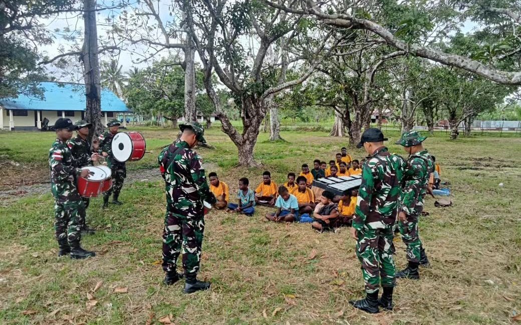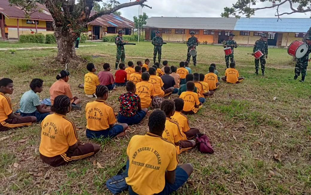 Dalam upaya mendukung pengembangan bakat dan keterampilan siswa di daerah terpencil, personel Satgas Kewilayah RI-PNG Yonif 141/AYJP Pos Kimaam memberikan pelatihan drumband kepada siswa SMPN 1 Kimaam di halaman sekolah SMPN 1 Kimaam. Papua. Sabtu (07/09/2024)