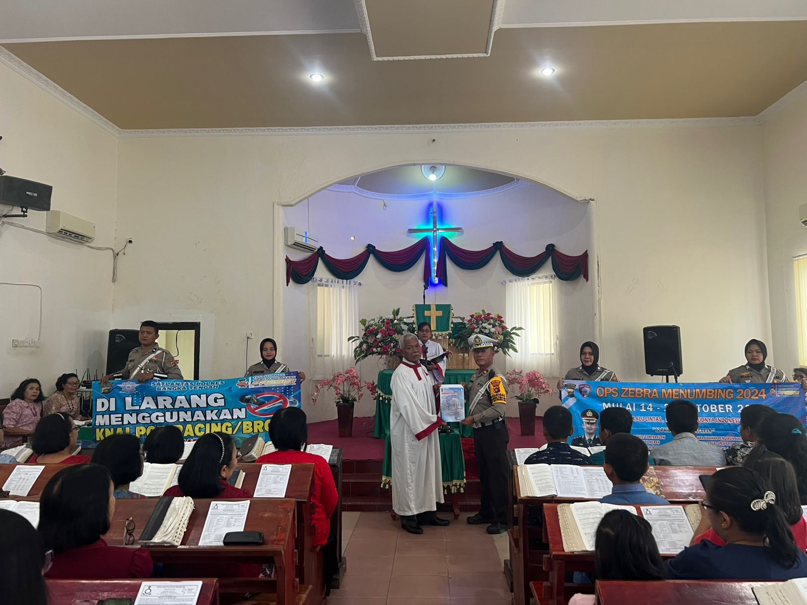Sat Lantas Polres Bangka Tengah melaksanakan Sosialisasi dan himbauan laka lantas serta pemutihan pajak Dalam Rangka Ops Zebra Menumbing 2024 kepada Jemaat Gereja HKBP Koba Bangka Tengah saat pelaksanaan ibadah, Minggu (20/10/2024) pagi.