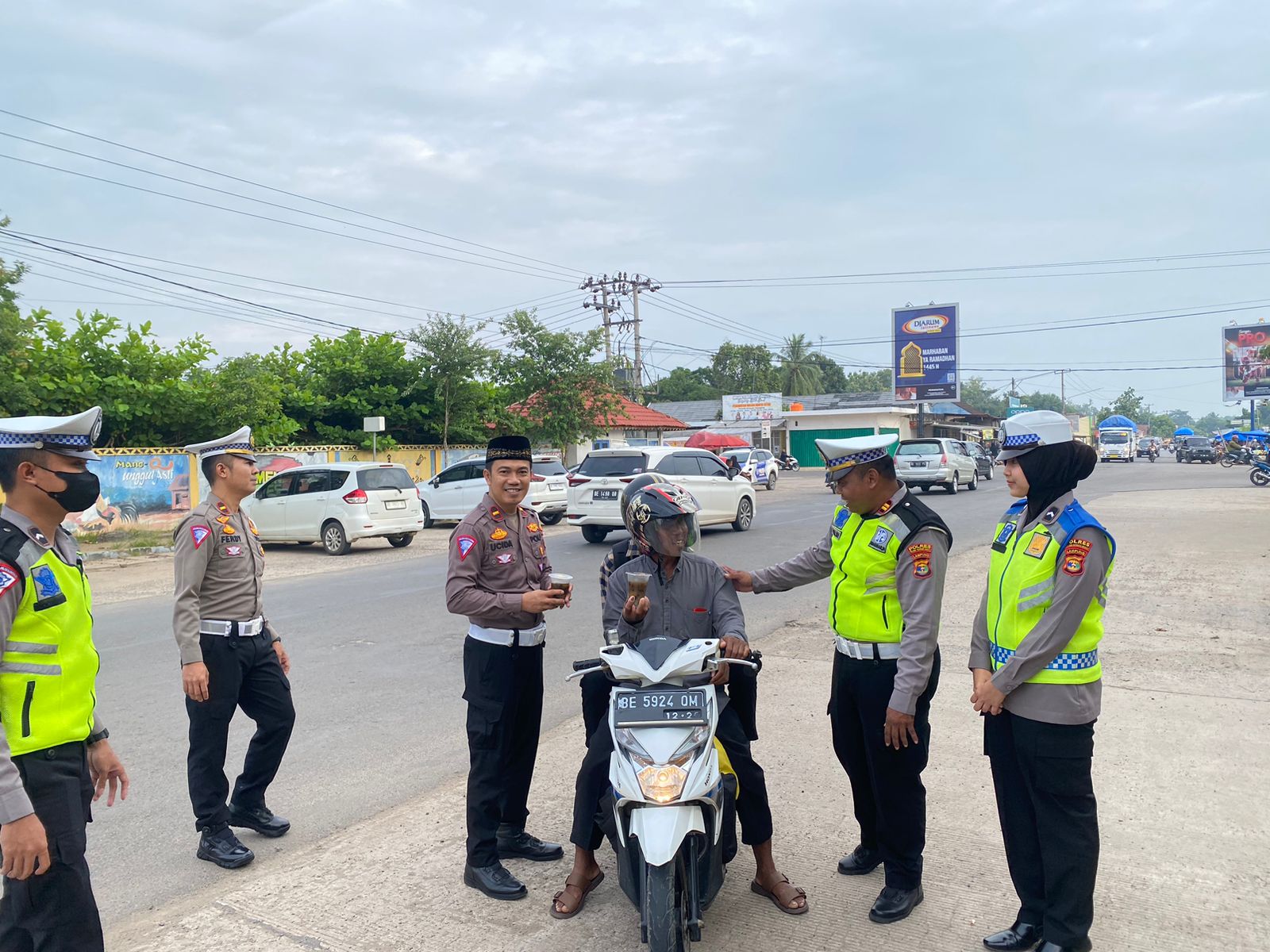 Personel Satlantas Polres Tulang Bawang Barat,membagikan ratusan takjil bagi pengguna jalan yang melintas di Jalan Raya pulung kencana tempatnya depan pasar pulung kencana, Rabu (13/3/2024) sore.