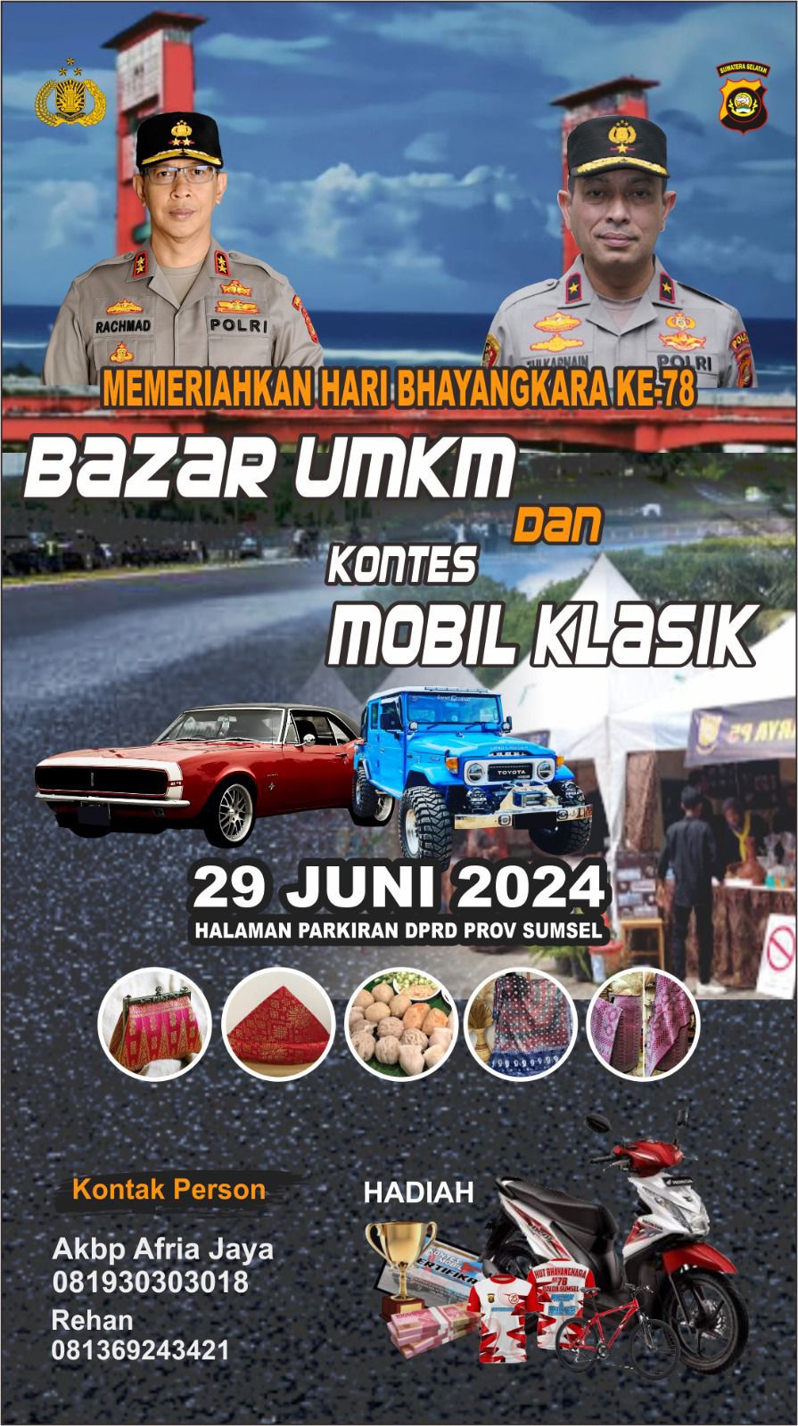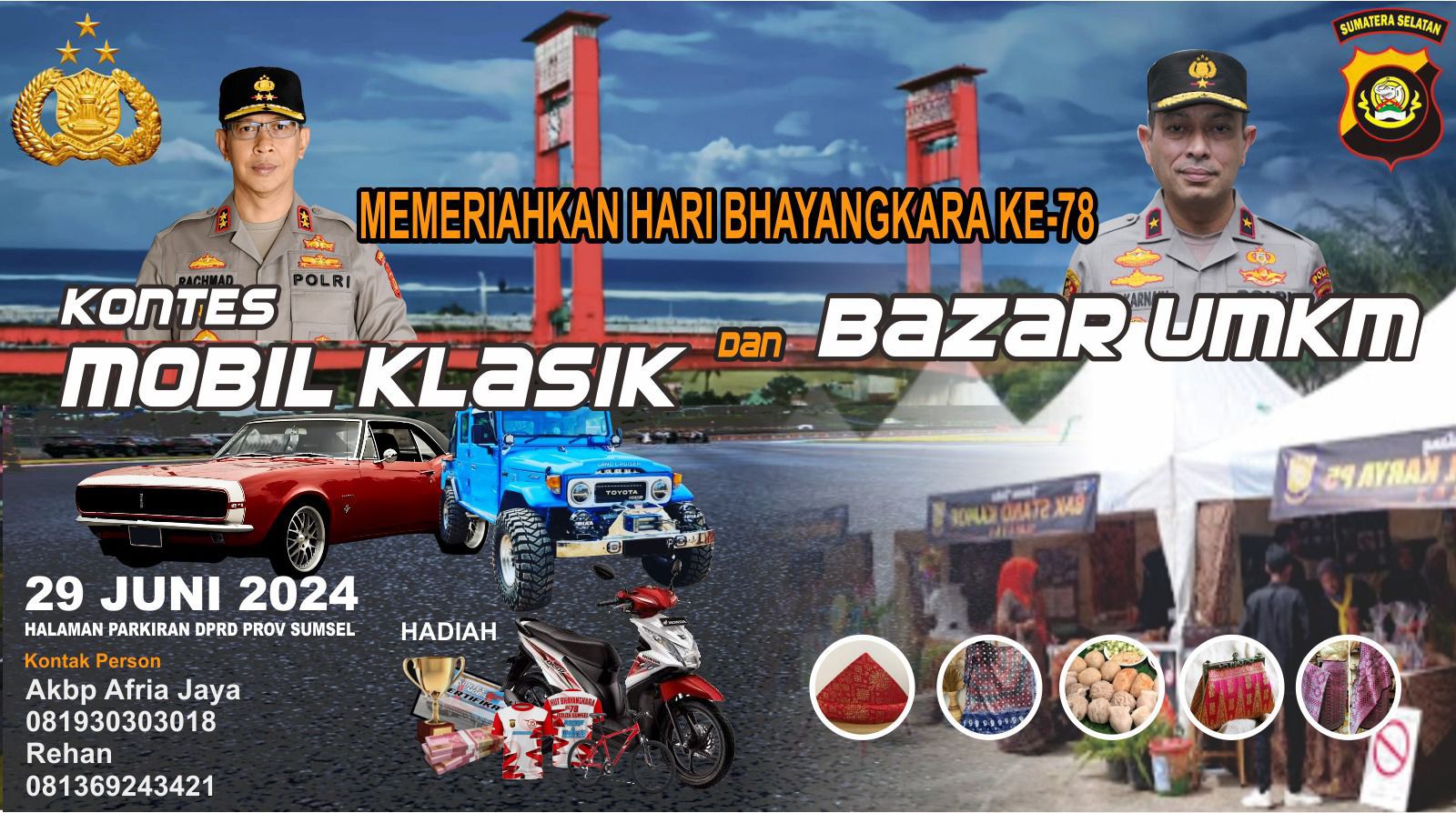 Selain beberapa agenda yang sudah berjalan, kedepan Polda Sumsel juga akan menghiasi kemeriahan Hari Bhayangkara dengan kegiatan yang sedikit unik. Salah satunya adalah, dengan mengadakan acara Bazar UMKM dan Kontes Mobil Klasik.
