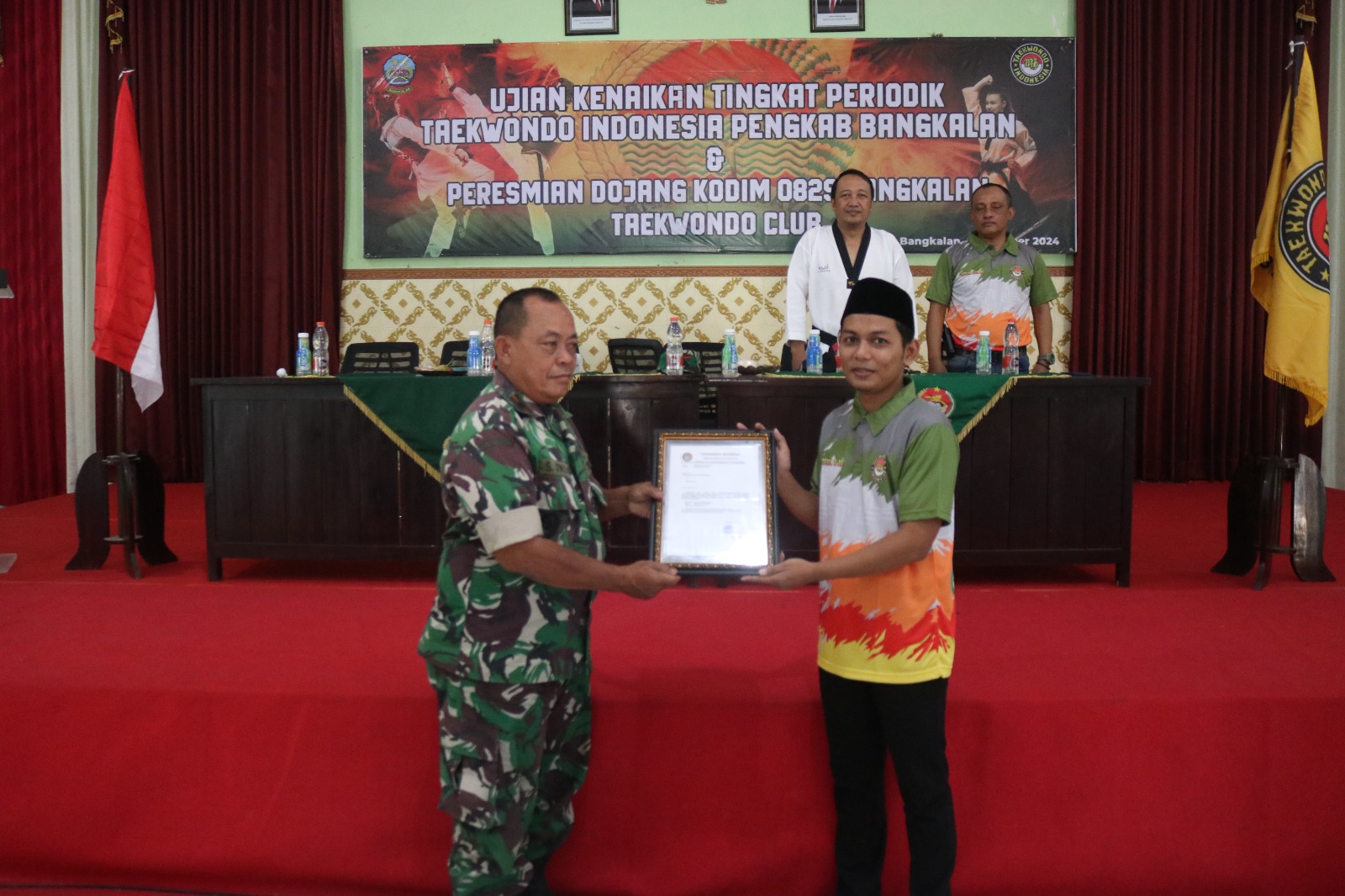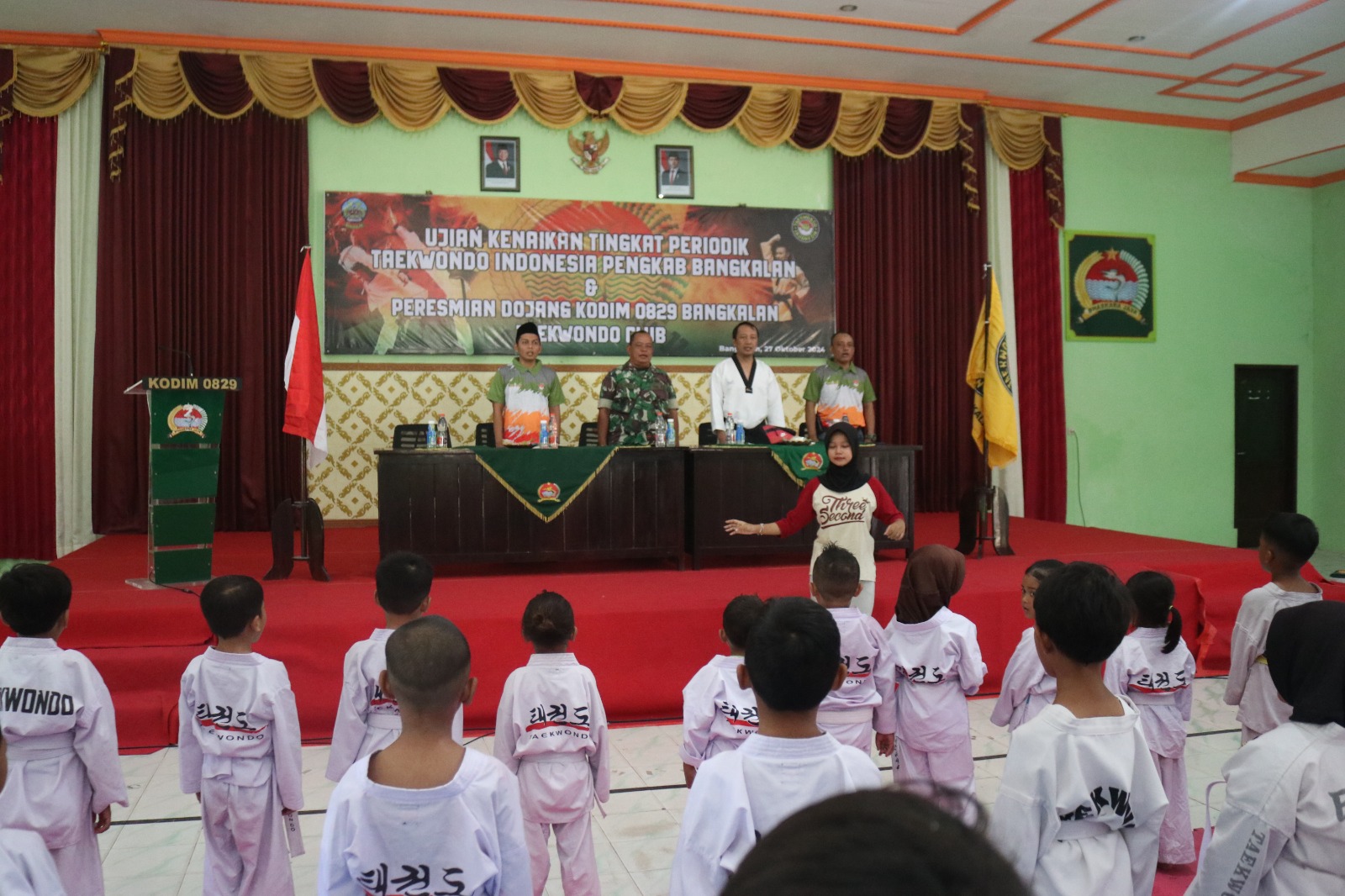 Bangkalan |Jatim | Mewakili Komandan Kodim 0829/Bangkalan Letkol Inf Nanang Fahrur Rozi, S Pd. Ws. Kasdim Mayor Inf Slamin Joko Darmawan Hadiri Uji Kenaikan Tingkat Taekwondo Indonesia Pengkab Bangkalan serta Resmikan Dojang Kodim 0829/Bangkalan Taekwondo Club Tahun 2024 Di Aula Manunggal Makodim Bangkalan. Minggu. (27/10/2024).