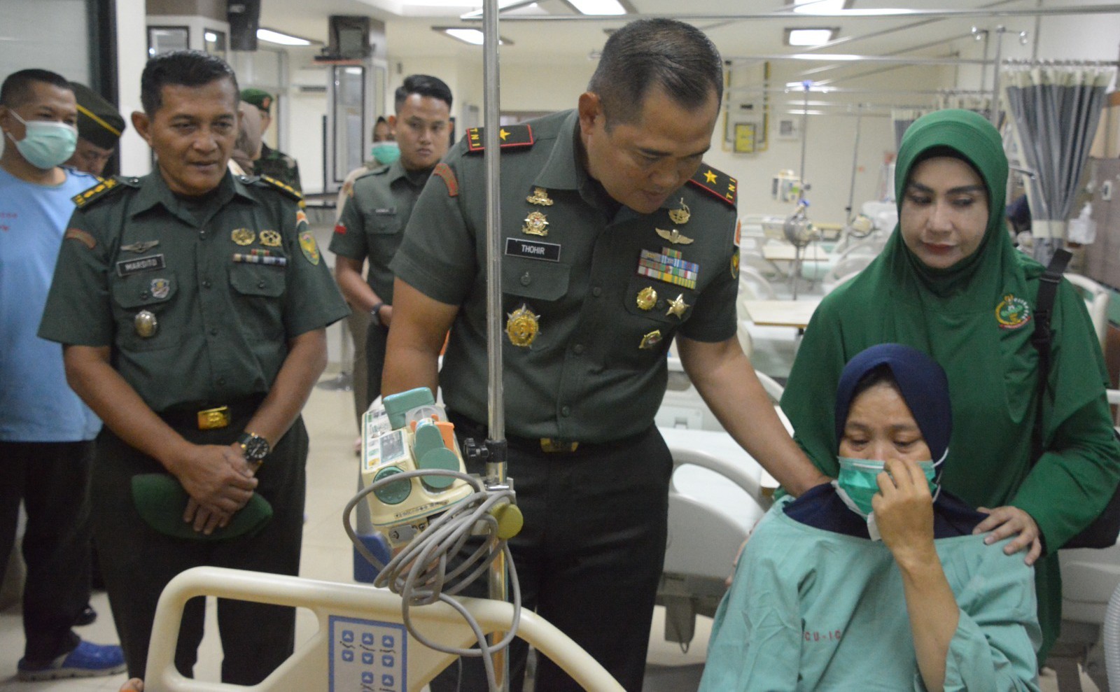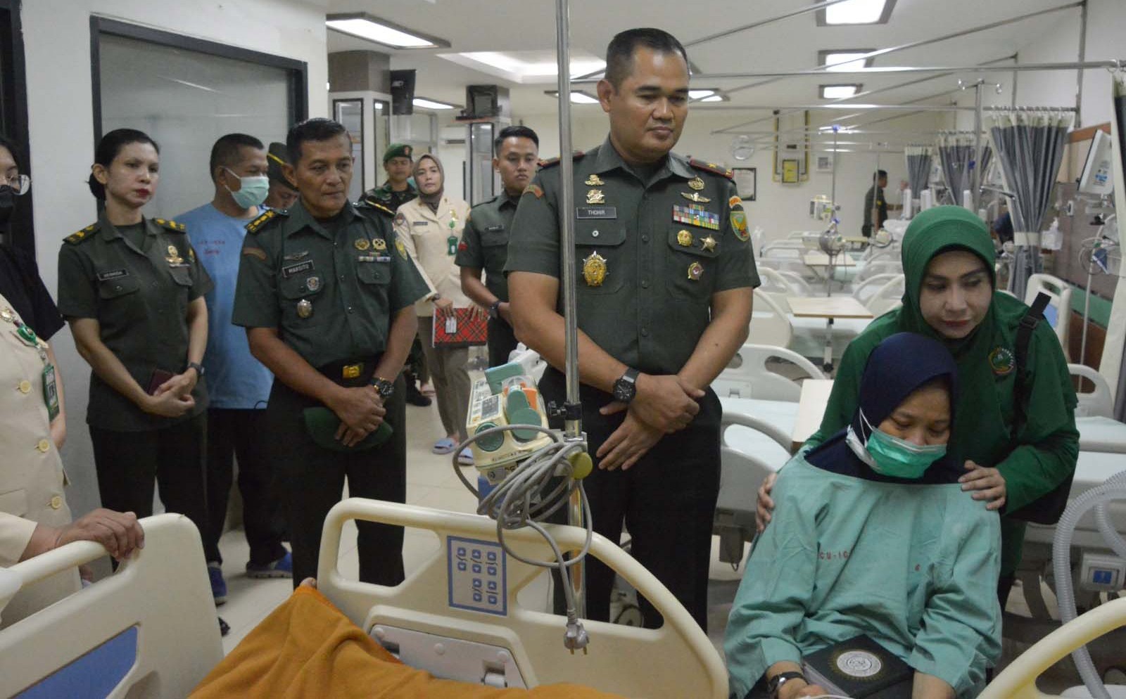 Danrem 044/Gapo Brigjen TNI Muhammad Thohir, S.Sos., M.M didampingi Ibu Ketua Persit KCK Koorcab Rem 044 menjenguk anggotanya yang mengalami kecelakaan di RS. dr. AK Gani Kec. Bukit Kecil Kota Palembang, Kamis (7/3/2024).