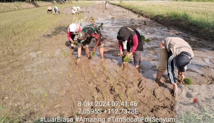 Bangkalan |Jatim | Babinsa Koramil 02/Socah Kodim 0829/Bangkalan Sertu Mustain bersama Mantri Tani, PPL dan warga melaksanakan penanaman Padi di lahan milik Bapak Abdul Azis ketua kelompok tani makmur 1 di dusun Bilaporah Utara, Desa Bilaporah, Kecamatan Socah, Kabupaten Bangkalan, Selasa (8/10/2024).