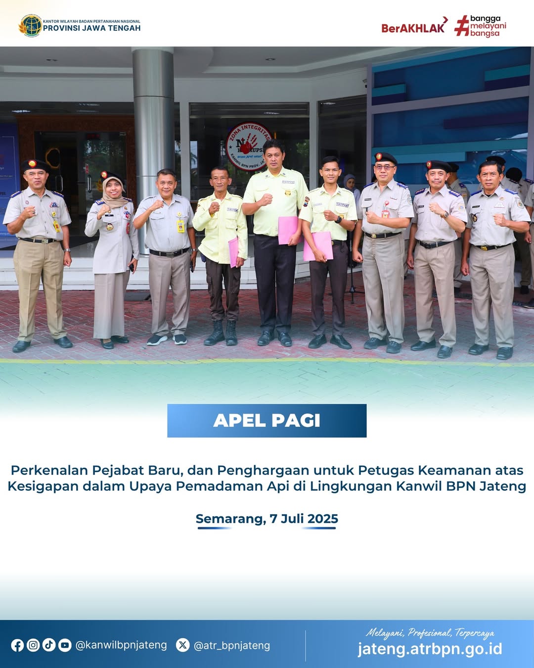 Senin (30/06/2025), Kantor Wilayah BPN Provinsi Jawa Tengah menggelar apel pagi bersama seluruh jajaran pegawai. Kegiatan ini menjadi momen penting untuk memperkuat semangat kebersamaan, disiplin, dan komitmen pelayanan kepada masyarakat.