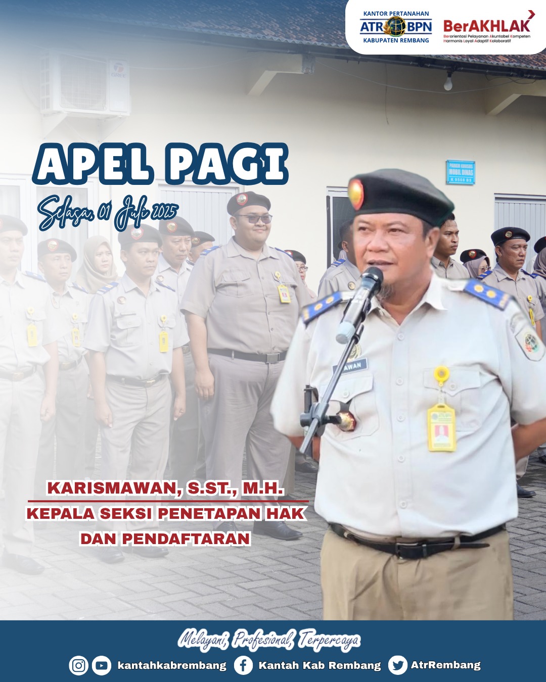 Apel pagi ini tidak hanya menjadi momen penyampaian arahan, tetapi juga wujud konsistensi dalam menumbuhkan budaya kerja yang disiplin dan bertanggung jawab di lingkungan Kantor Pertanahan Kabupaten Rembang.