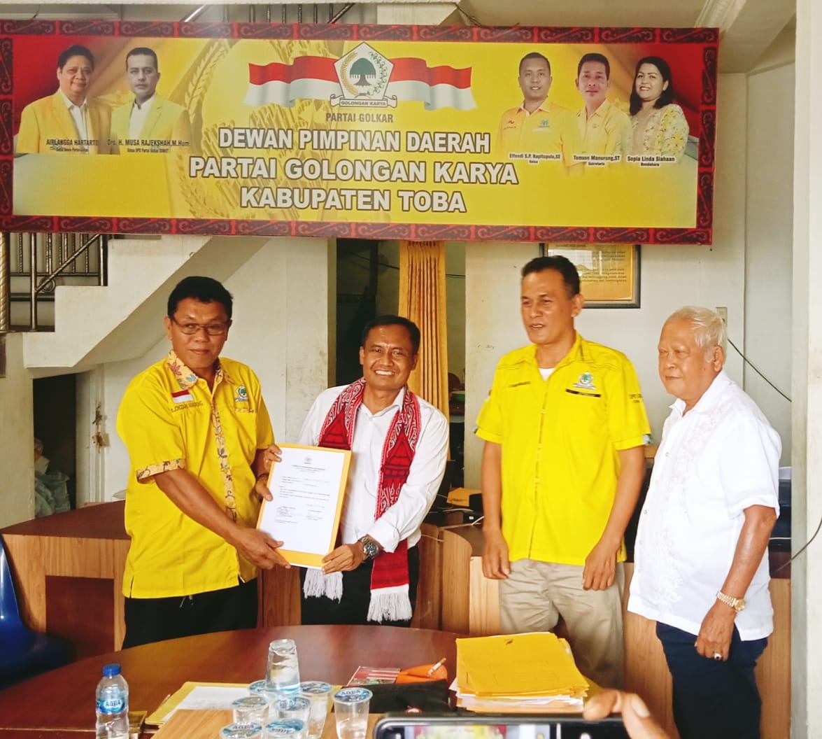 Balon Bupati Toba, Charles D. Sirait, S.Si, bersama team pemenangan selesai Pengembalian Formulir di kantor DPD Golkar Toba di Balige, Selasa, 23 April 2024. beliau menyempatkan waktunya untuk bertemu dengan Wartawan/Pers di Balige.