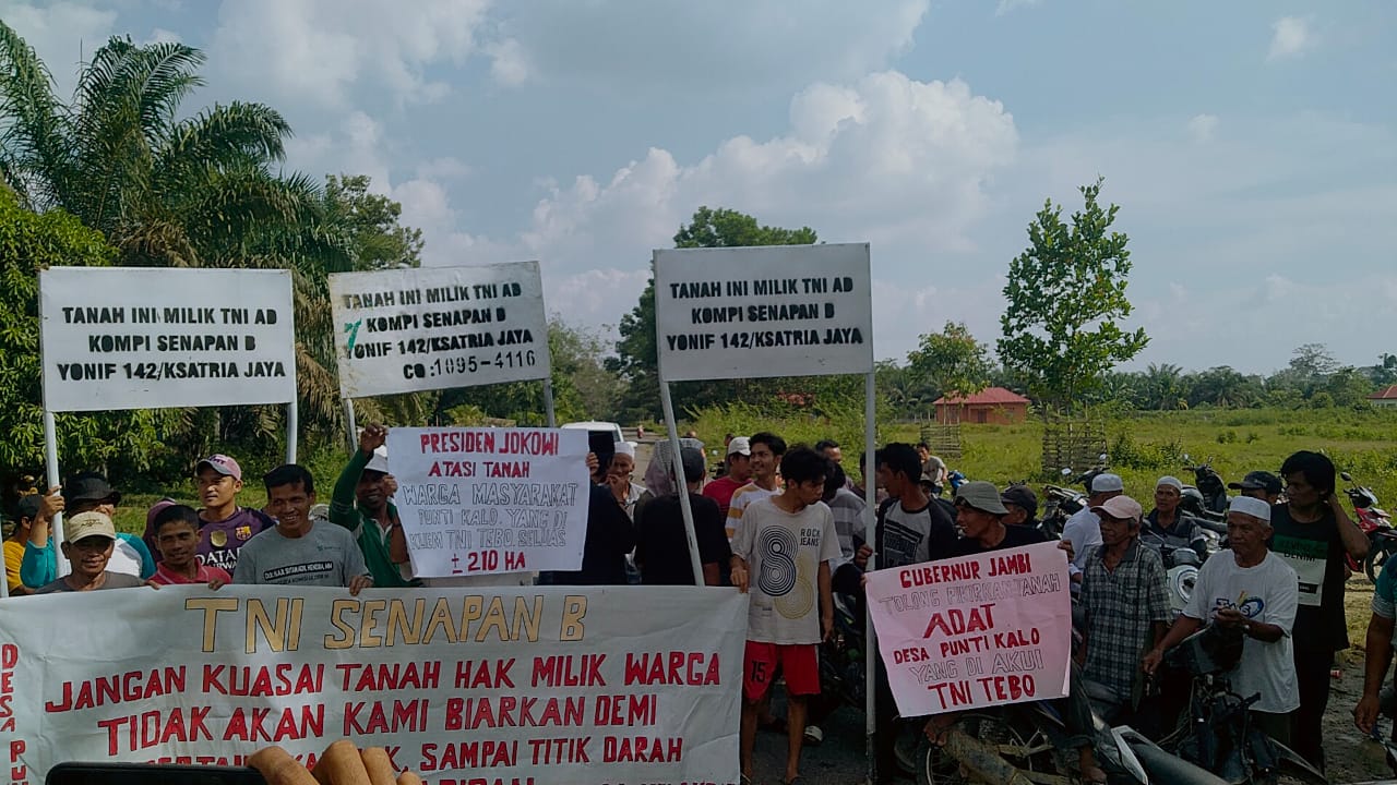 Tebo (Jambi) Kompas86.com__, Ratusan warga Desa Punti Kalo, Kecamatan Sumay, Kabupaten Tebo, menggelar aksi spontan pada Jumat, 17 Mei 2024. Aksi spontan ini sebagai bentuk protes terhadap pemasangan patok oleh TNI di lahan milik warga pada Sabtu lalu.