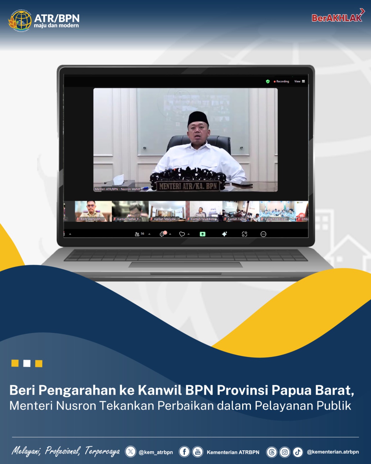 Jakarta,Kompas86.com – Menteri Agraria dan Tata Ruang/Kepala Badan Pertanahan Nasional (ATR/BPN), Nusron Wahid memberikan pengarahan untuk pertama kali ke jajaran Kantor Wilayah (Kanwil) BPN Provinsi Papua Barat, Senin (02/12/2024) via daring. Ia berkenalan sekaligus menekankan agar jajaran memberikan pelayanan terbaik bagi masyarakat.