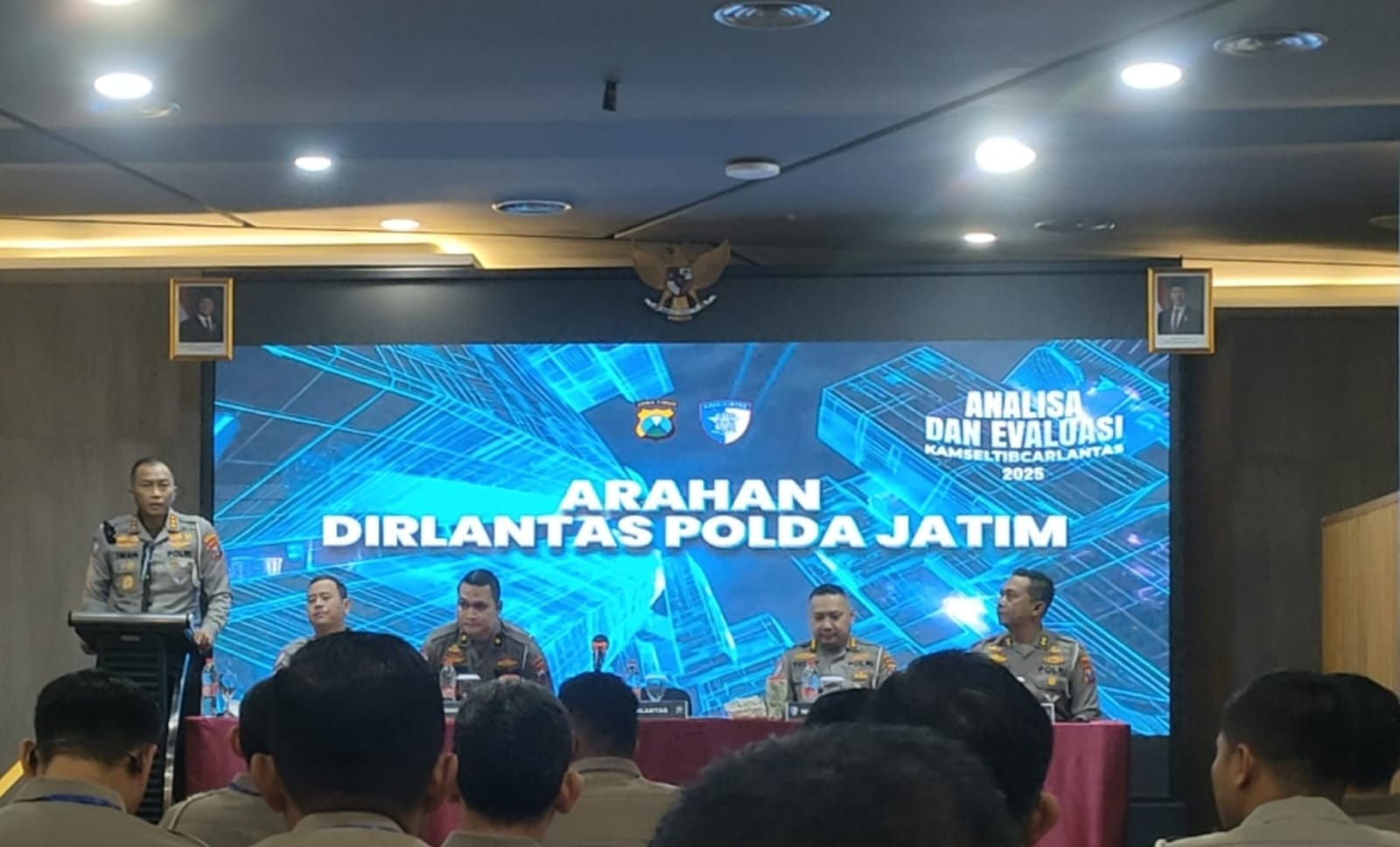 Anev tersebut dihadiri langsung oleh Dirlantas Polda Jatim beserta para Pejabat Utama (PJU) Ditlantas, Kasatlantas dari seluruh Polres jajaran Polda Jatim, Kanit Turjawali, serta Kanit Kamsel Satlantas se-Jawa Timur.