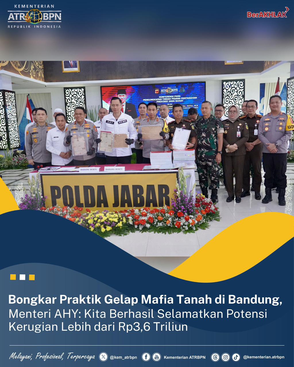 Bandung,Kompas86.com – Menteri Agraria dan Tata Ruang/Kepala Badan Pertanahan Nasional (ATR/BPN), Agus Harimurti Yudhoyono (AHY) kembali mengungkap kasus tindak pidana pertanahan yang dilakukan oleh mafia tanah. Dalam konferensi pers yang berlangsung di Mapolda Jawa Barat, Jumat (18/10/2024), ia membeberkan kasus di Kota dan Kabupaten Bandung yang telah mengakibatkan kerugian, baik bagi masyarakat maupun bagi negara dengan total senilai Rp3,65 triliun.