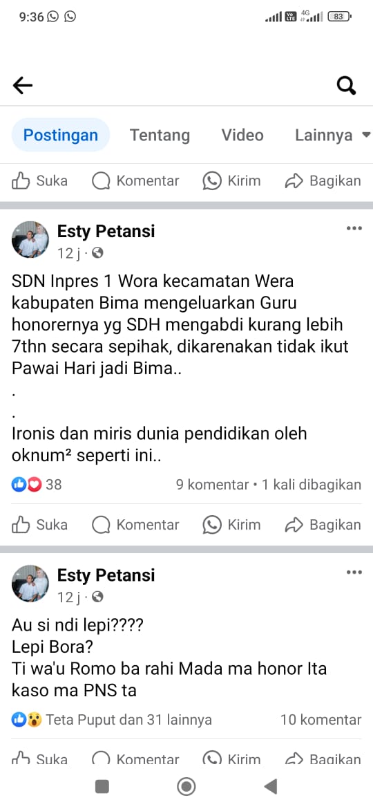 Bima NTB kompas86.com.Lagi viral Kepala Sekaloah SDN Impres Satu wora memecat guru dalam branda Facebook bernama Esti petansi ,, esti mengeluarkan pernyataan keras terhadap kepala sekolah yang melakukan pemecatan sepihak terhadap guru SDN satu wora isi beranda Facebook tersebut