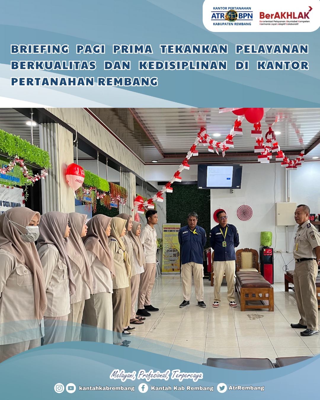 Rembang – Kantor Pertanahan Kabupaten Rembang menggelar Briefing Pagi Prima yang dipimpin oleh Manager Loket, Nuryanto, pada Senin (11/08/2025). Kegiatan ini diikuti oleh seluruh Petugas Loket dan Satpam, bertempat di area pelayanan kantor.