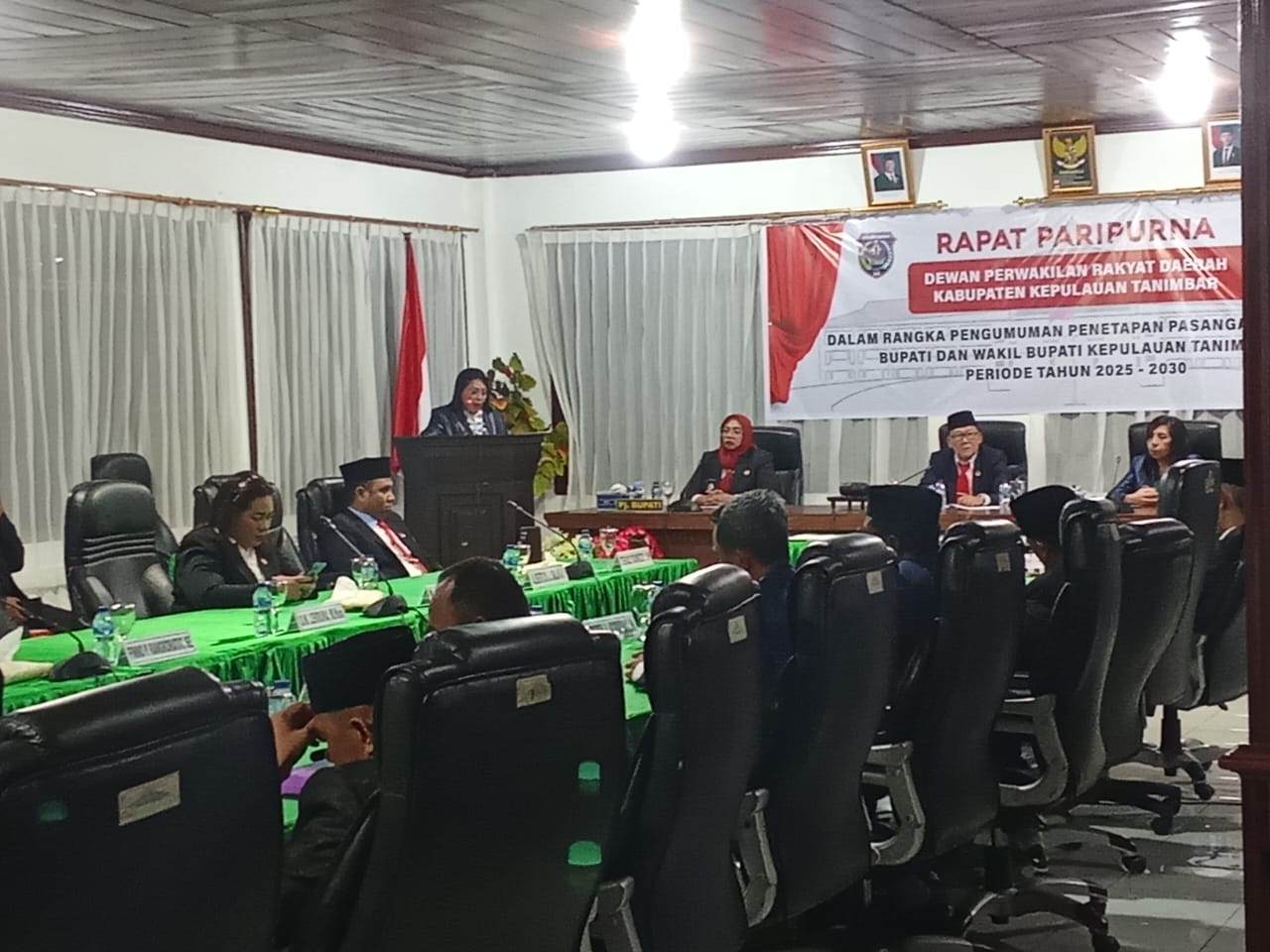 Dewan Perwakilan Rakyat Daerah (DPRD) Kabupaten Kepulauan Tanimbar (KKT) menggelar Rapat Paripurna dalam rangka pengumuman penetapan pasangan Bupati dan Wakil Bupati Kepulauan Tanimbar periode 2025-2030, Ricky Jauwerissa dan dr.Juliana C Ratuanak, berlangsung di kantor DPRD Kewarbotan Saumlaki Jum’at, (07/02/2024).