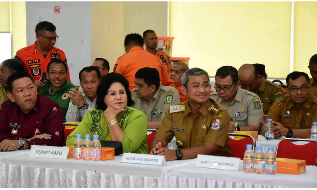 Bupati Karo, Cory Srywati Sebayang, bersama Penjabat Bupati Deli Serdang, Ir Wiriya Alrahman, ikuti rapat koordinasi penanganan bencana Hidrometeorologi di aula Badan Pengembangan Sumber Daya Manusia (BPSDM) Sumatera Utara, Jalan Ngalengko, Medan, pada Selasa (3/12/2024).