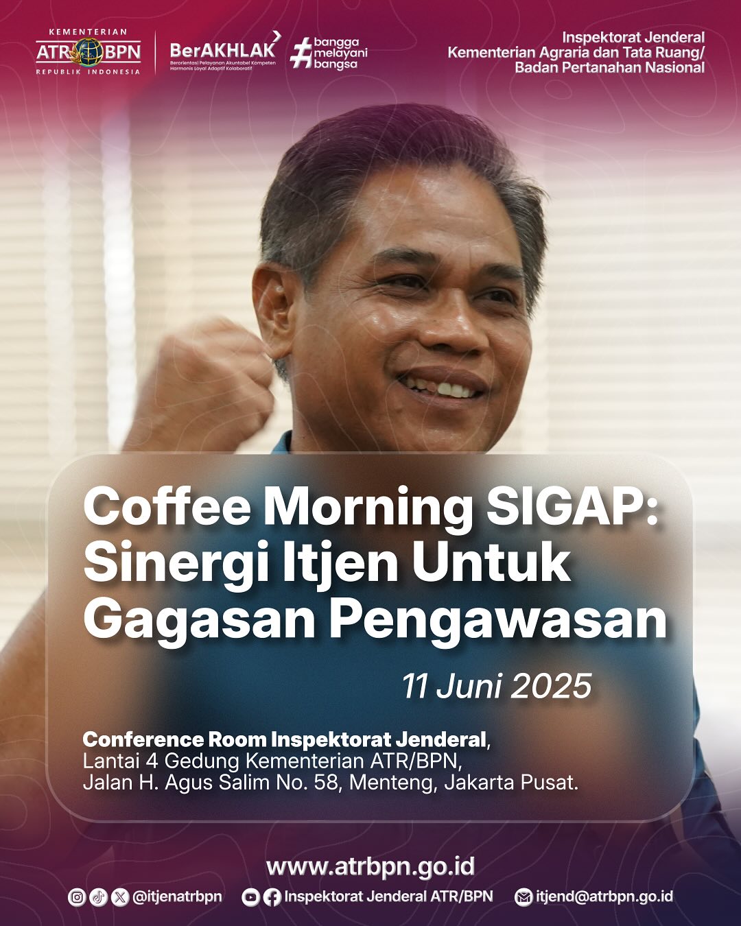 Coffee Morning SIGAP menjadi inisiatif baru dari Itjen ATR/BPN dan akan diselenggarakan secara rutin setiap bulan ke depannya. Tujuannya adalah menciptakan ruang informal namun produktif yang mendorong komunikasi lintas bidang, memperkuat solidaritas internal, serta merespons tantangan pengawasan dengan pendekatan yang lebih adaptif dan inovatif.
