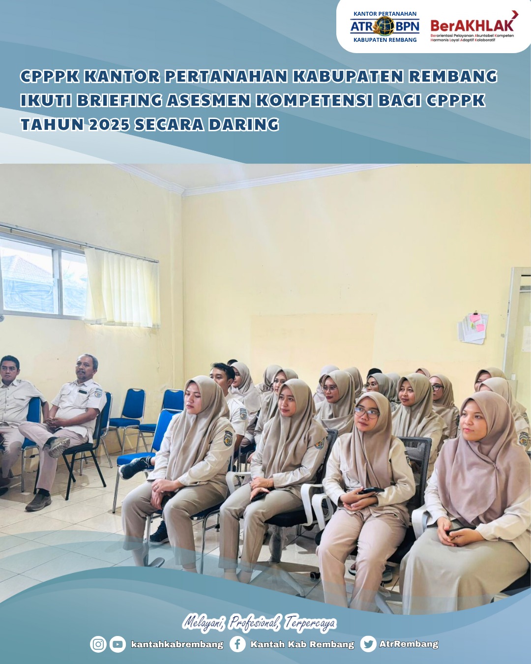 Rembang – Seluruh Calon Pegawai Pemerintah dengan Perjanjian Kerja (CPPPK) di lingkungan Kantor Pertanahan Kabupaten Rembang mengikuti kegiatan briefing pelaksanaan asesmen kompetensi secara daring pada Selasa (15/07/2025). Kegiatan ini merupakan bagian dari rangkaian persiapan pelaksanaan asesmen bagi seluruh CPPPK di lingkungan Kementerian Agraria dan Tata Ruang/Badan Pertanahan Nasional (ATR/BPN) Tahun 2025.