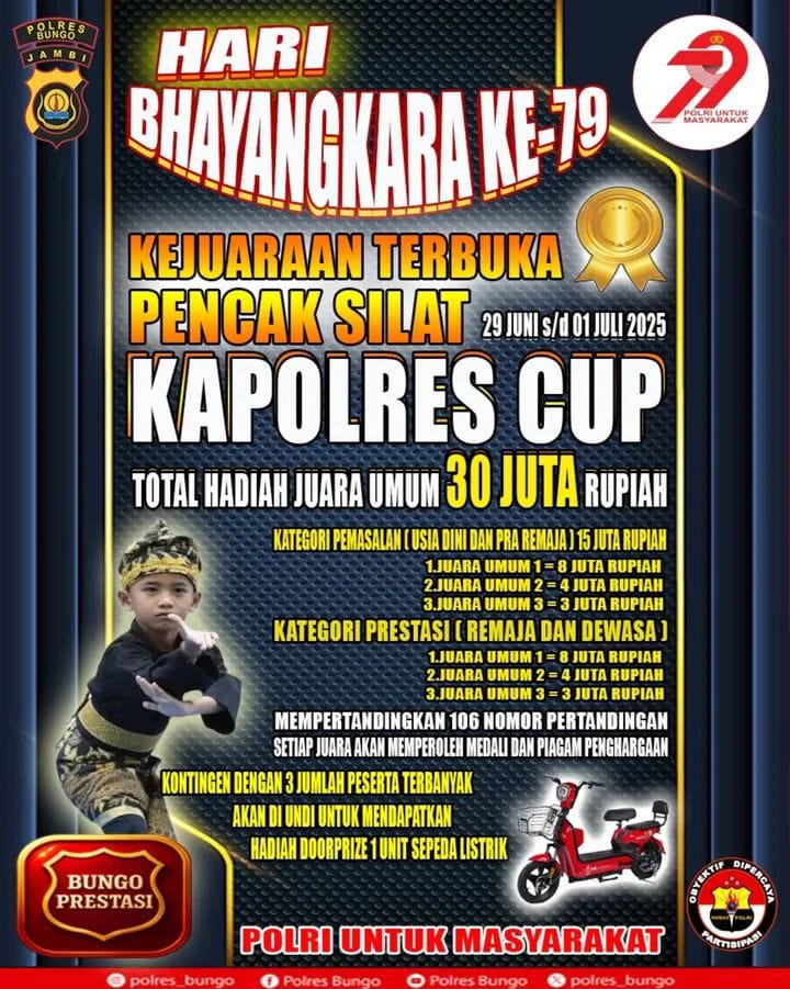 Dalam rangka memperingati Hari Ulang Tahun (HUT) Bhayangkara ke-79, Polres Bungo menggelar kejuaraan terbuka pencak silat Kapolres Cup tahun 2025 yang akan di mulai pada tanggal 29-01 Juli 2025.